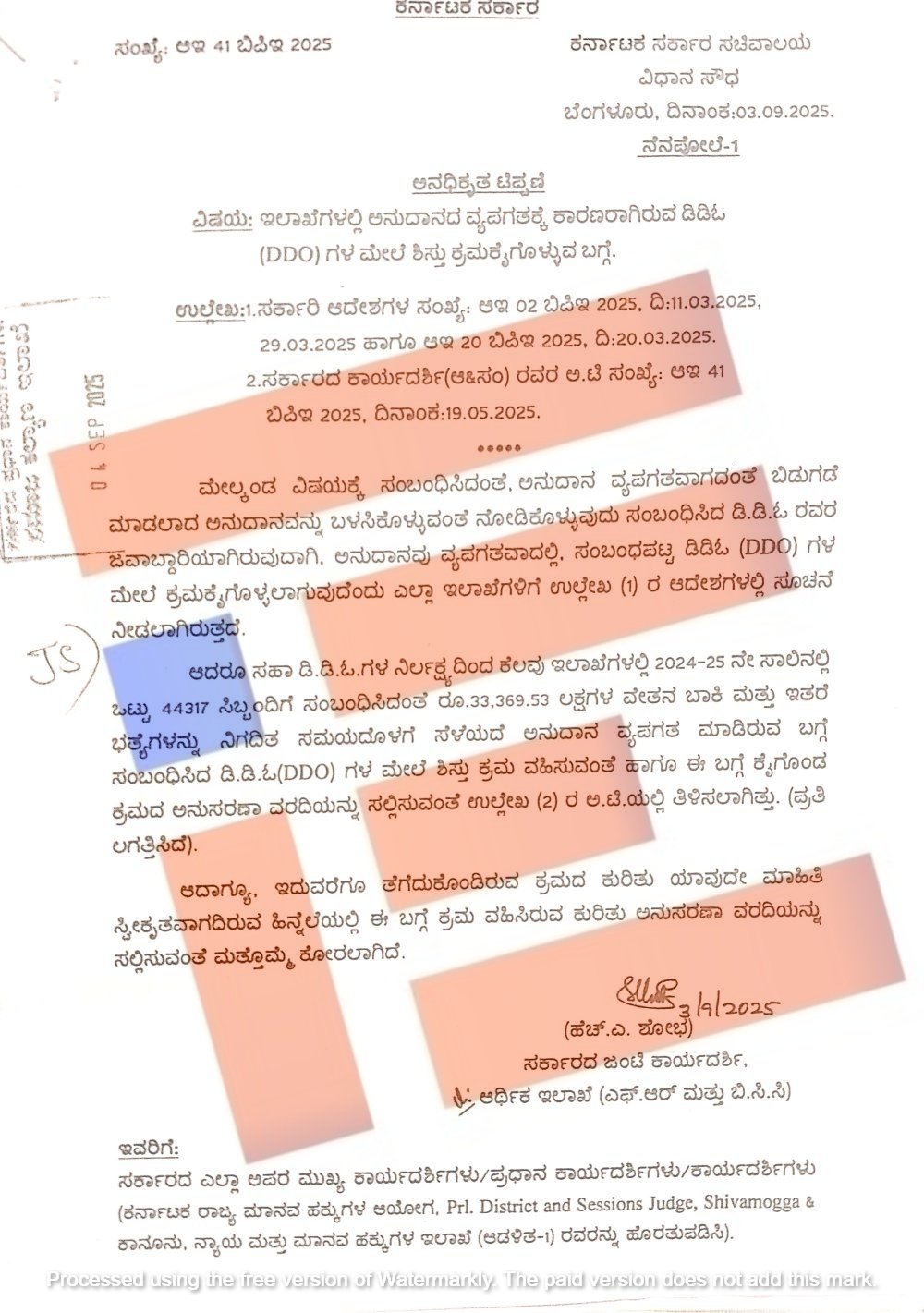 ಹೀಗಾಗಿ ಇಲಾಖೆಯ ಮತ್ತೊಬ್ಬ ಜಂಟಿ ಕಾರ್ಯದರ್ಶಿ ಹೆಚ್ ಎ ಶೋಭ ಅವರು 2025ರ ಸೆಪ್ಟಂಬರ್ 3ರಂದು ಮತ್ತೊಂದು ಅನಧಿಕೃತ ಟಿಪ್ಪಣಿಯನ್ನು ಹೊರಡಿಸಿದ್ದಾರೆ. ಇದರ ಪ್ರತಿಯೂ ‘ದಿ ಫೈಲ್’ಗೆ ಲಭ್ಯವಾಗಿದೆ.