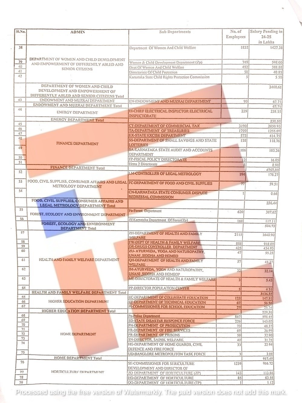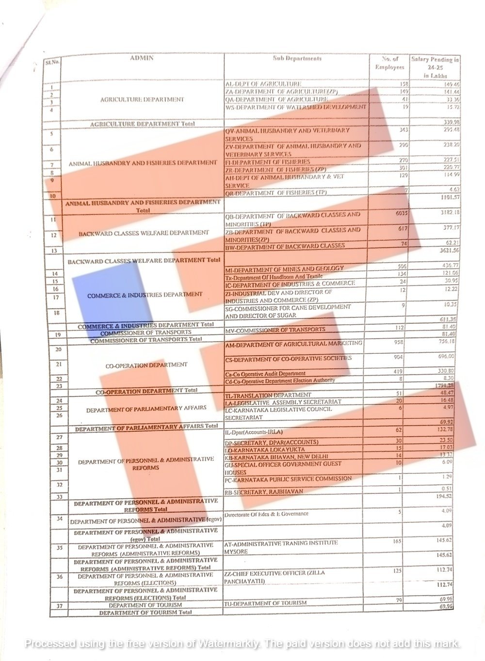 ಸಮಾಜ ಕಲ್ಯಾಣ ಇಲಾಖೆಯಲ್ಲಿ 4 ಕೊಟಿ 83 ಲಕ್ಷ, ನಗರಾಭಿವೃದ್ಧಿ ಇಲಾಖೆಯಲ್ಲಿ 1 ಕೋಟಿ 27 ಲಕ್ಷ, ಜಲ ಸಂಪನ್ಮೂಲ ಇಲಾಖೆಯಲ್ಲಿ 16 ಲಕ್ಷ 52 ಸಾವಿರ, ಯುವ ಸಬಲೀಕರಣ ಮತ್ತು ಕ್ರೀಡಾ ಇಲಾಖೆಯಲ್ಲಿ 1 ಕೋಟಿ 47 ಲಕ್ಷ ರು ಸೇರಿ ಒಟ್ಟಾರೆ 336 ಕೋಟಿಯಷ್ಟು ವೇತನ ಬಾಕಿ ಇತ್ತು ಎಂಬುದು ಪತ್ರದಿಂದ ತಿಳಿದು ಬಂದಿದೆ.
