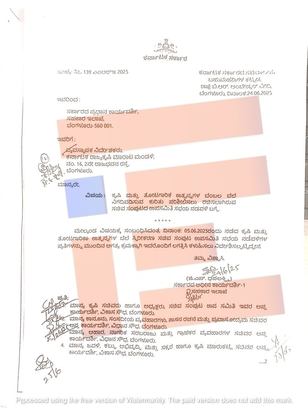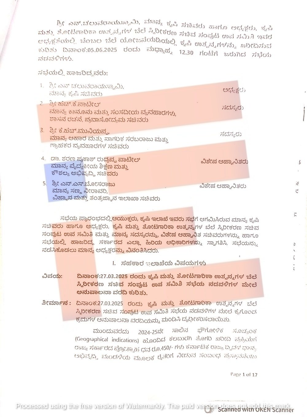 ಕೃಷಿ ಉತ್ಪನ್ನ ತೋಟಗಾರಿಕೆ ಉತ್ಪನ್ನಗಳ ಬೆಂಬಲ ಬೆಲೆ ನಿಗದಿಪಡಿಸುವ ಸಂಬಂಧ ಸಚಿವ ಎನ್ ಚೆಲುವರಾಯಸ್ವಾಮಿ ಅಧ್ಯಕ್ಷತೆಯಲ್ಲಿರುವ ಸಂಪುಟ ಉಪ ಸಮಿತಿಯು 2025ರ ಜೂನ್ 5ರಂದು ಪರಿಶೀಲನೆ ನಡೆಸಿತ್ತು. ಈ ಸಮಿತಿಯು ಈ ನಷ್ಟವನ್ನು ಅಂದಾಜಿಸಿದೆ.