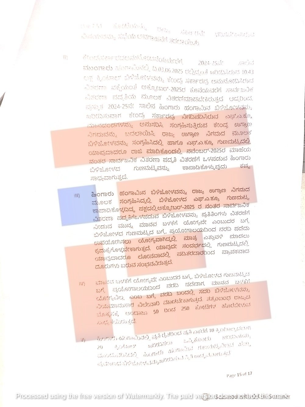 ಭತ್ತ, ರಾಗಿ, ಬಿಳಿ ಜೋಳ ಖರೀದಿಸಲು ಹಾಗೂ ಆಹಾರ ಧಾನ್ಯ ಮಾರಾಟ ಮಾಡಿದ ರೈತರಿಗೆ ಡಿಬಿಟಿ ಮೂಲಕ ಹಣ ಪಾವತಿ ಮಾಡಲು ಆವರ್ತ ನಿಧಿಯಿಂದ ದ್ವಿತೀಯ ಮತ್ತು ತೃತೀಯ ಹಂತದಲ್ಲಿ ಆರ್ಥಿಕ ಇಲಾಖೆಯ ಸಹಮತಿ ಪಡೆದು 1,000 ಕೋಟಿ ರು.ಗಳ ಮೊತ್ತವನ್ನು ಬಿಡುಗಡೆ ಮಾಡಲು ಸಮ್ಮತಿಸಿದೆ.