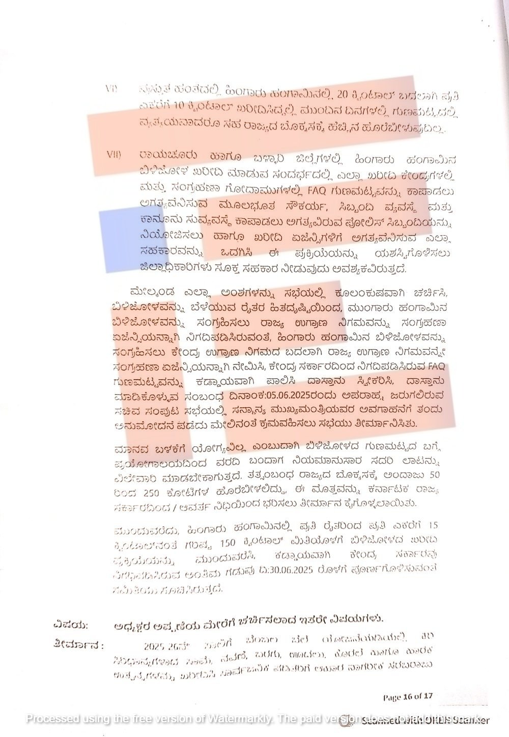ಪ್ರಸ್ತುತ ಹಂತದಲ್ಲಿ ಹಿಂಗಾರು ಹಂಗಾಮಿನಲ್ಲಿ 20 ಕ್ವಿಂಟಾಲ್ ಬದಲಾಗಿ ಪ್ರತಿ ಎಕರೆಗೆ 10 ಕ್ವಿಂಟಾಲ್ ಖರೀದಿಸಿದಲ್ಲಿ ಮುಂದಿನ ದಿನಗಳಲ್ಲಿ ಗುಣಮಟ್ಟದಲ್ಲಿ ವ್ಯತ್ಯಯವಾದರೂ ರಾಜ್ಯದ ಬೊಕ್ಕಸಕ್ಕೆ ಹೊರೆಯಾಗುವುದಿಲ್ಲ ಎಂದು ಉಪ ಸಮಿತಿಯು ಅಭಿಪ್ರಾಯಿಸಿರುವುದು ಗೊತ್ತಾಗಿದೆ.