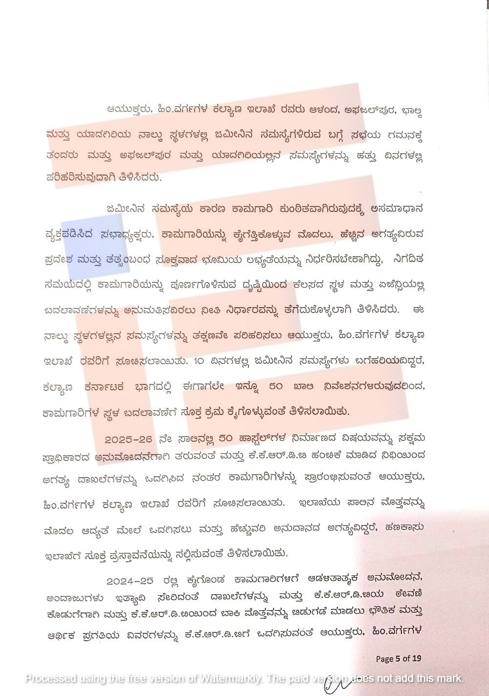 ಈ ಕುರಿತು ಸಭೆಯಲ್ಲಿ ಚರ್ಚೆಯಾಗಿದೆ. ಕಳೆದ ವರ್ಷ ಮಂಜೂರು ಮಾಡಿದ ಕಾಮಗಾರಿಗಳಿಗೆ ಅನುದಾನವನ್ನು ಸಂಪೂರ್ಣವಾಗಿ ಬಳಸಿಲ್ಲ. ಹಿಂದುಳಿದ ವರ್ಗ ಕಲ್ಯಾಣ ಇಲಾಖೆಗೆ ಈಗಾಗಲೇ ಲಭ್ಯವಿರುವ ಅನುದಾನವನ್ನು ಕೆಕೆಆರ್ಡಿಬಿ ನಿಧಿಯೊಂದಿಗೆ ಮುಖ್ಯ ಆದ್ಯತೆ ಆಧಾರದ ಮೇಲೆ ಬಳಸಿಕೊಳ್ಳಬೇಕು. ಕಾಮಗಾರಿಯನ್ನು ಕೈಗೊಳ್ಳಬೇಕು ಎಂದು ಸೂಚಿಸಿರುವುದು ಗೊತ್ತಾಗಿದೆ.