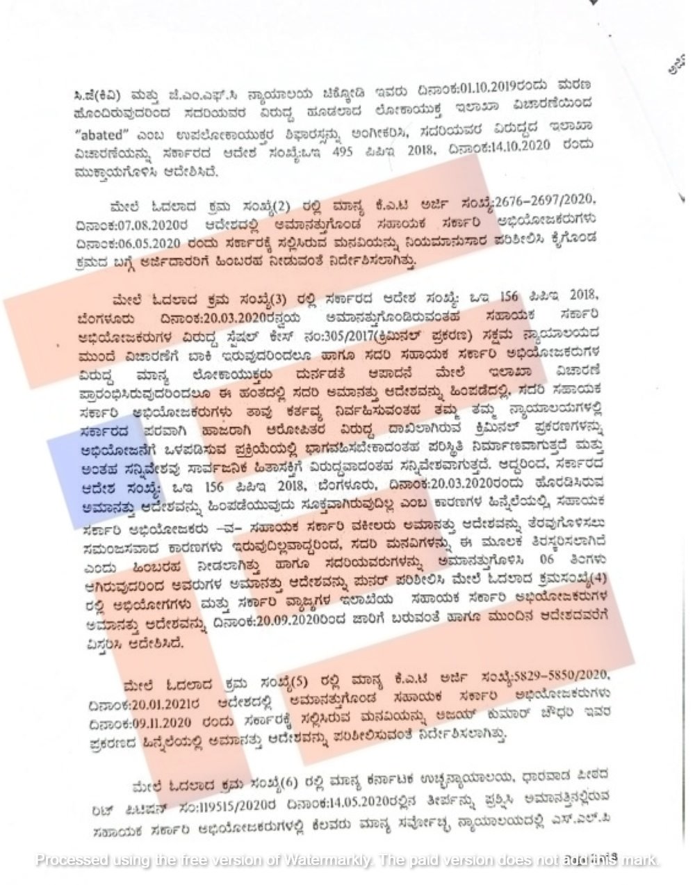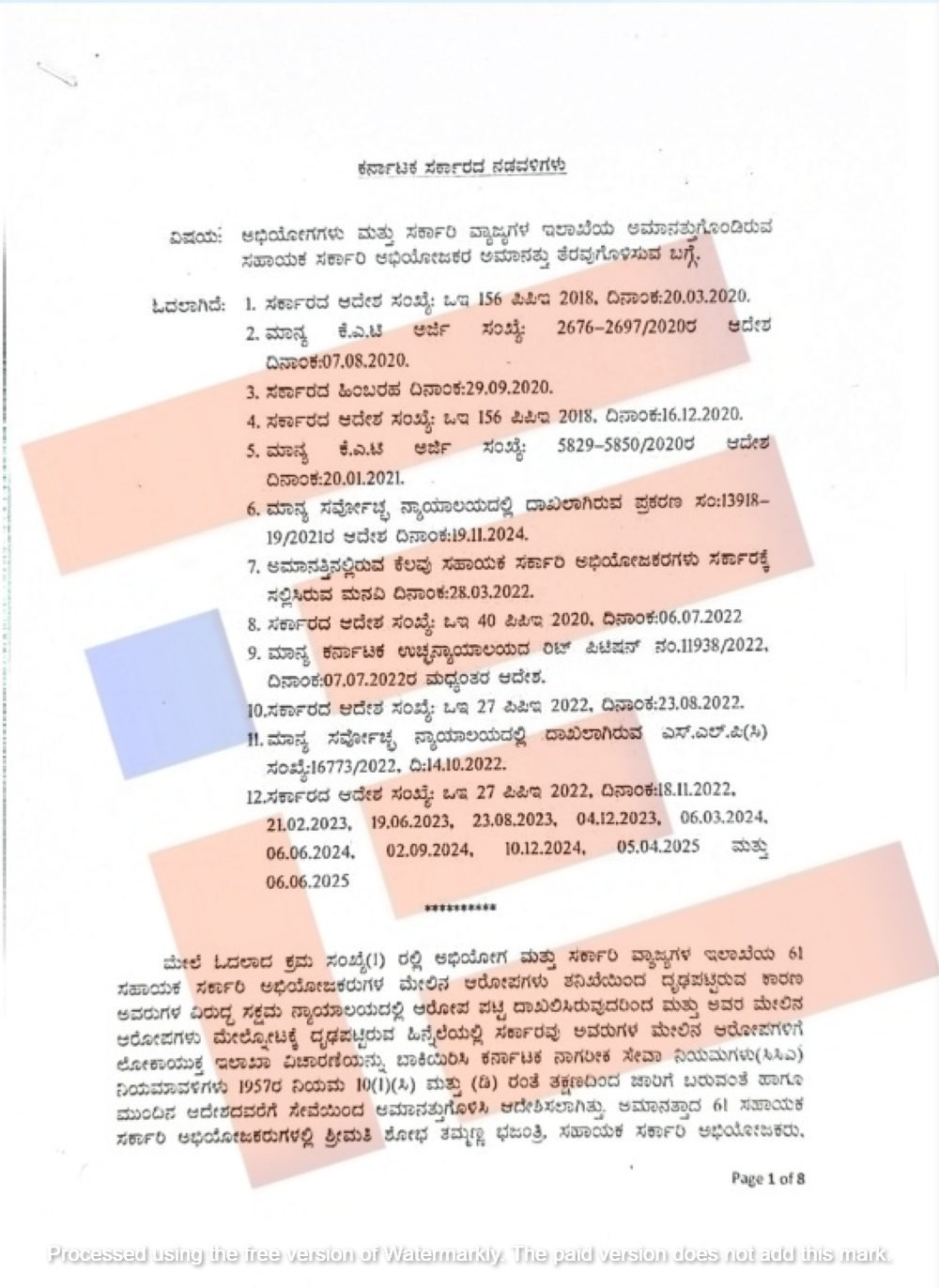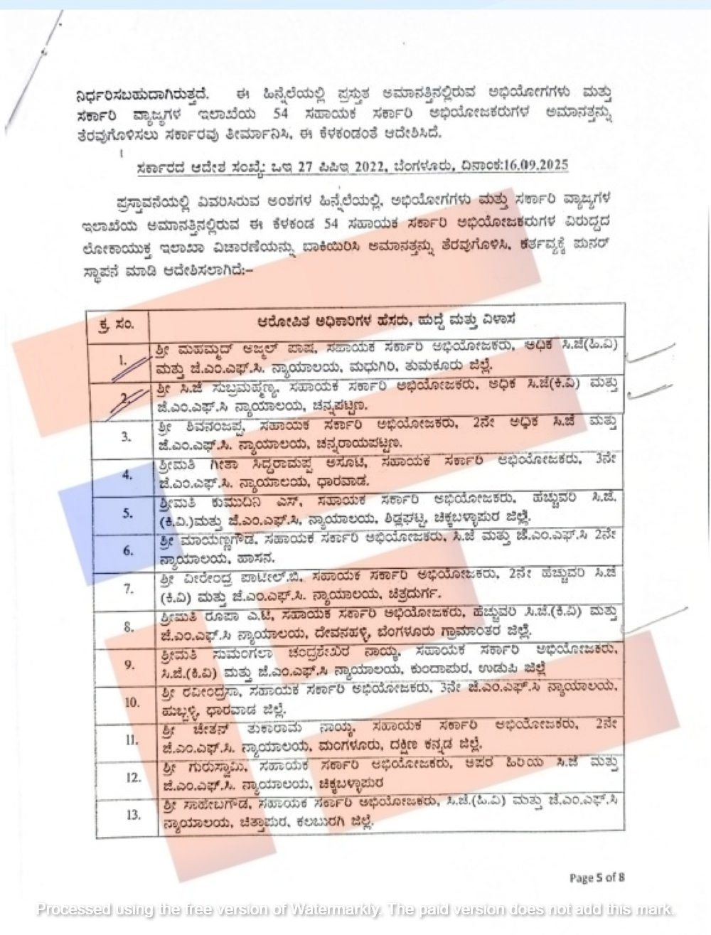 ಅಮಾನತಿಲ್ಲಿರುವ ಸಹಾಯಕ ಸರ್ಕಾರಿ ಅಭಿಯೋಜಕರುಗಳನ್ನುಕರ್ನಾಟಕ ಲೋಕಾಯುಕ್ತ ಶಿಫಾರಸ್ಸಿನ ಅನ್ವಯ ಮತ್ತು ಕರ್ನಾಟಕ ನಾಗರಿಕ ಸೇವಾ ನಿಯಮಗಳೂ ನಿಯಮ 8 (viii) ಅನ್ವಯ 6 ಮಂದಿ ಸಹಾಯಕ ಸರ್ಕಾರಿ ಅಭಿಯೋಜಕರ ಸೇವೆಯಿಂದ ತೆಗೆದುಹಾಕಿ ವಜಾಗೊಳಿಸಿ ಆದೇಶಿಸಿತ್ತು.