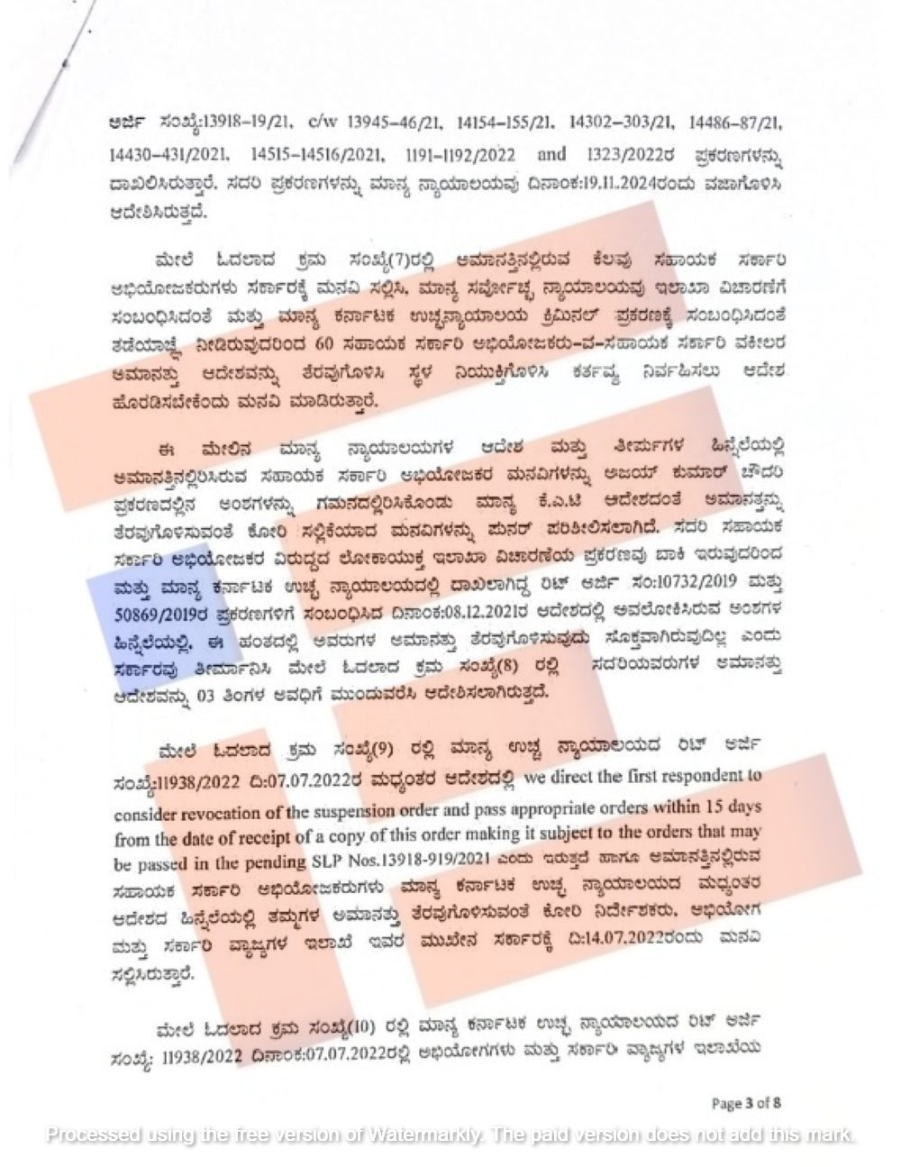 ಆದರೂ ಸರ್ಕಾರಿ ಅಭಿಯೋಜಕರುಗಳು ಉಚ್ಛ ನ್ಯಾಯಾಲಯವು 2022ರ ಜುಲೈ 7ರಂದು ನೀಡಿದ್ದ ಮಧ್ಯಂತರ ಆದೇಶವದಲ್ಲಿನ ಅಂಶಗಳನ್ನು ಮುಂದಿರಿಸಿ ತಮ್ಮ ಅಮಾನತು ತೆರವುಗೊಳಿಸಬೇಕು ಎಂದು 2022ರ ಜುಲೈ 14ರಂದು ಮತ್ತೊಂದು ಮನವಿ ಸಲ್ಲಿಸಿದ್ದರು. ಆದರೆ ಇವರ ಅಮಾನತು ಆದೇಶವನ್ನು ಪುನರ್ ಪರಿಶೀಲಿಸಿ 60 ಸಹಾಯಕ ಸರ್ಕಾರಿ ಅಭಿಯೋಜಕರ ಅಮಾನತನ್ನು ಮುಂದಿನ 3 ತಿಂಗಳಿವರೆಗೆ ಮುಂದುವರೆಸಿ ಆದೇಶಿಸಲಾಗಿತ್ತು.