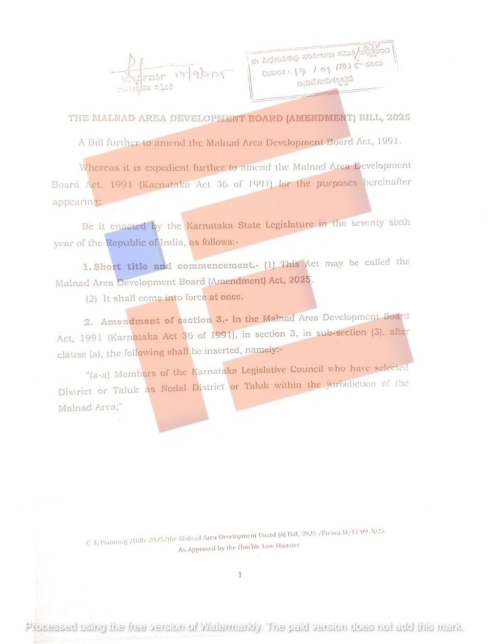 ಮಲೆನಾಡು ಪ್ರದೇಶಶಾಭಿವೃದ್ಧಿ ಮಂಡಳಿಯ ಅಧಿನಿಯಮಕ್ಕೆ ತರಲು ಹೊರಟಿರುವ ತಿದ್ದುಪಡಿ ಕುರಿತು 2023ರ ಜೂನ್ 221 ಮತ್ತು 2025ರ ಸೆ.17ರಂದು ಪರಿಶೀಲನಾ ಸಮಿತಿಯಲ್ಲಿ ಚರ್ಚೆಯಾಗಿದೆ. ಈ ತಿದ್ದುಪಡಿ ವಿಧೇಯಕವು ಭಾರತ ಸಂವಿಧಾನದ 7ನೇ ಅನುಸೂಚಿಯ 2ನೇ ಪಟ್ಟಿಯ 5ನೇ ಮತ್ತು 32ನೇ ನಮೂನೆ ಅಡಿಯಲ್ಲಿ ಬರಲಿದೆ.