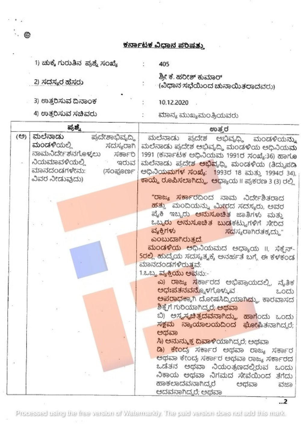 ಮಲೆನಾಡು ಪ್ರದೇಶಾಭಿವೃದ್ಧಿ ಮಂಡಳಿಗೆ ಕಾನೂನು ರೀತಿಯಲ್ಲಿ ವಿಧಾನ ಪರಿಷತ್ ಸದಸ್ಯರನ್ನು ನೇಮಕ ಮಾಡಲು ಮಂಡಳಿಯ ಅಧಿನಿಯಮ 1991ರಲ್ಲಿ ಅವಕಾಶವಿರಲಿಲ್ಲ. ಈ ಕುರಿತು ವಿಧಾನ ಪರಿಷತ್ ಸದಸ್ಯರು ಅಧಿನಿಯಮ ತಿದ್ದುಪಡಿಗೆ ಒತ್ತಾಯಿಸಿದ್ದರು. ಈ ಹಿಂದಿನ ಬಿಜೆಪಿ ಸರ್ಕಾರದ ಅವಧಿಯಲ್ಲಿಯೂ ಹರೀಶ್ ಕುಮಾರ್ ಅವರು ವಿಧಾನಪರಿಷತ್ ಅಧಿವೇಶನದಲ್ಲಿ ಈ ಕುರಿತು ಪ್ರಶ್ನೆ ಕೇಳಿದ್ದರು.