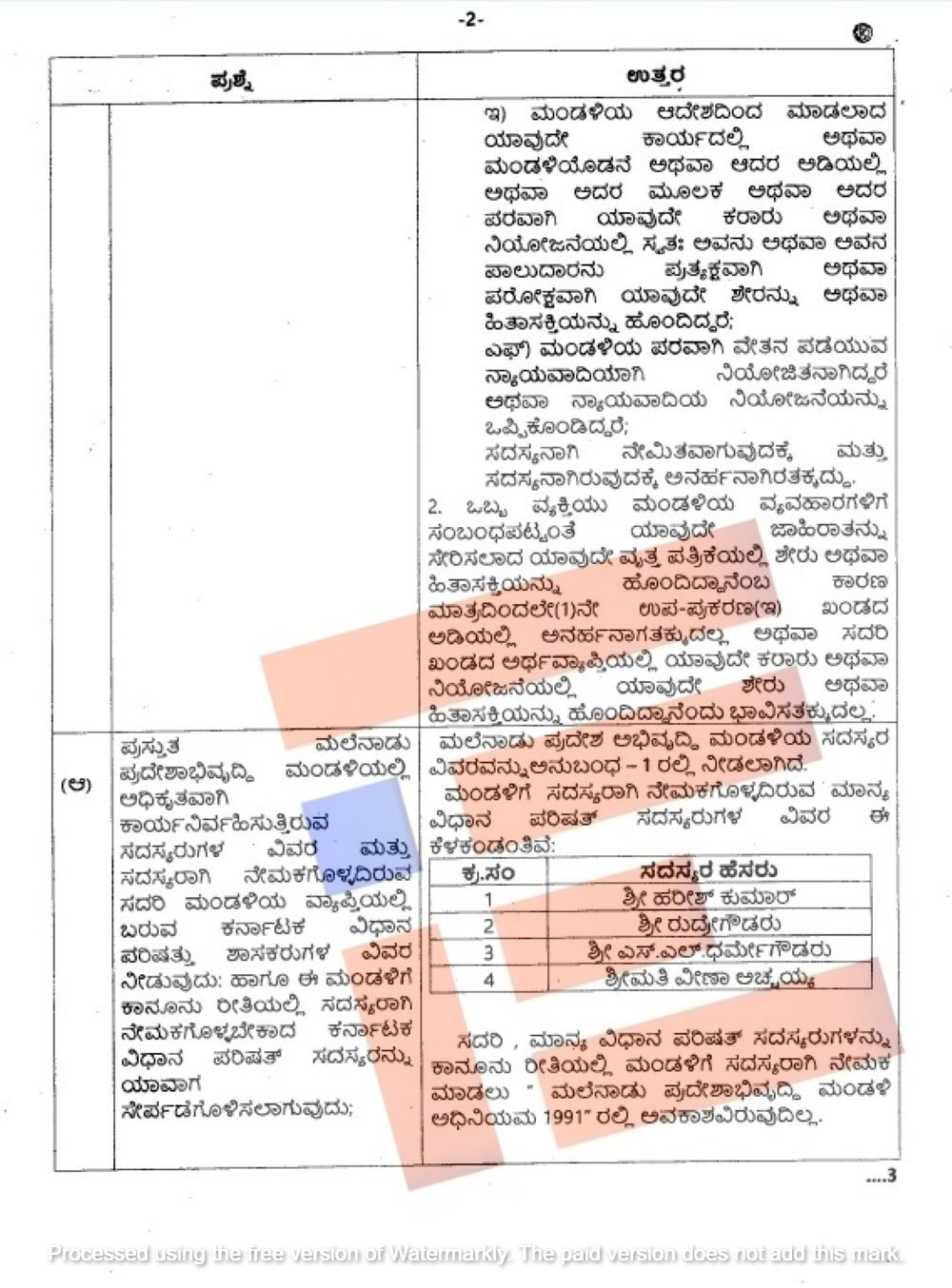 ಆಗ ಮುಖ್ಯಮಂತ್ರಿಯಾಗಿದ್ದ ಯಡಿಯೂರಪ್ಪ ಅವರು ಕಾನೂನು ರೀತಿಯಲ್ಲಿ ಮಂಡಳಿಗೆ ವಿಧಾನ ಪರಿಷತ್ ಸದಸ್ಯರನ್ನು ನೇಮಕ ಮಾಡಲು ಅವಕಾಶವಿರುವುದಿಲ್ಲ ಎಂದು ಉತ್ತರಿಸಿದ್ದರು.