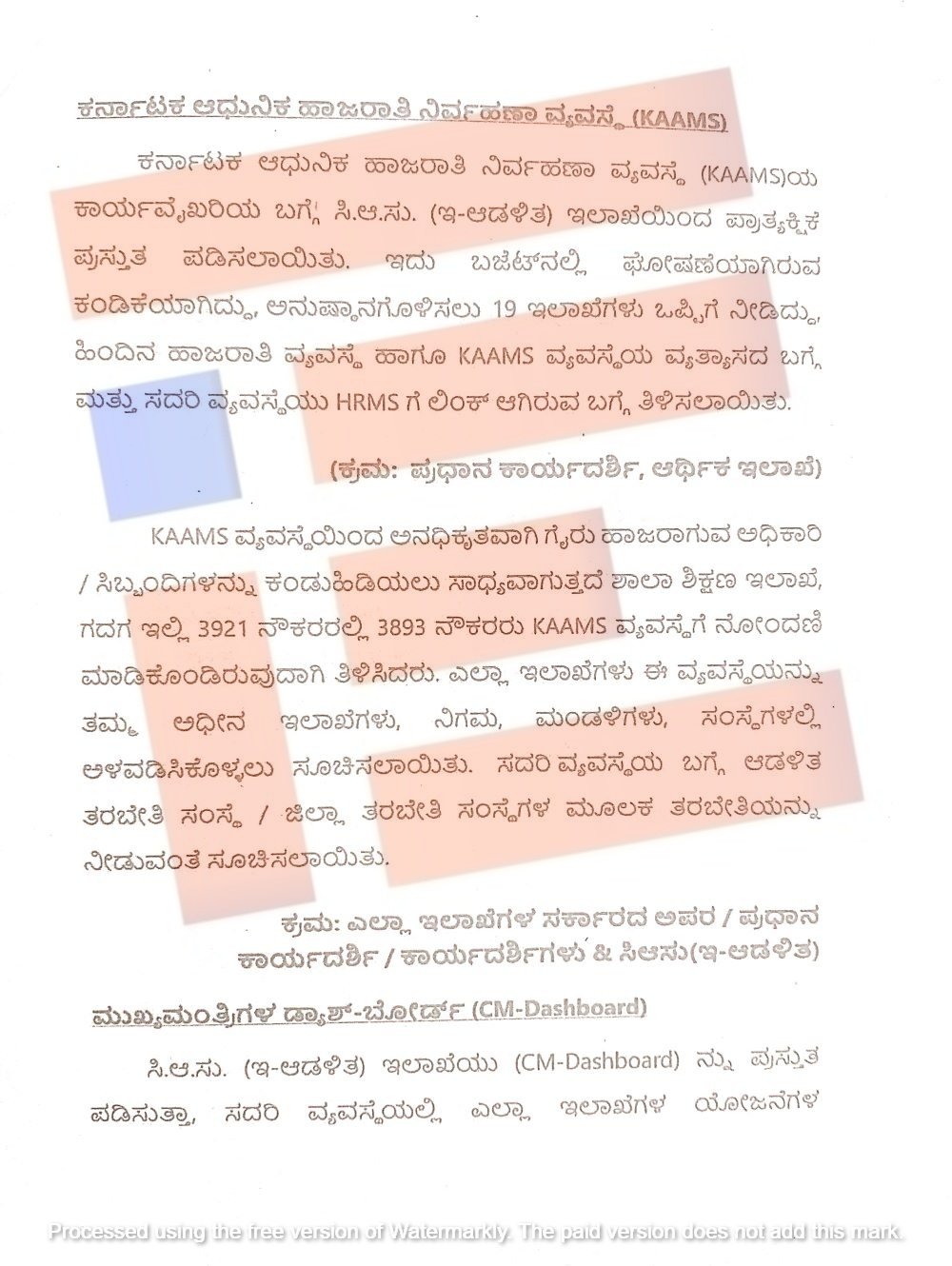 ಕರ್ನಾಟಕ ಸರ್ಕಾರಿ ನೌಕರರ ಹಾಜರಾತಿ ನಿರ್ವಹಣೆ ವ್ಯವಸ್ಥೆ (KAAMS) ಕಾರ್ಯವೈಖರಿ ಕುರಿತು ಸಭೆಯಲ್ಲಿ ಚರ್ಚೆಯಾಗಿದೆ. ಸರ್ಕಾರಿ ಕಚೇರಿಗಳಲ್ಲಿನ ಹಿಂದಿನ ಹಾಜರಾತಿ ವ್ಯವಸ್ಥೆ ಹಾಗೂ ಹಾಲಿ ಕರ್ನಾಟಕ ಸರ್ಕಾರಿ ನೌಕರರ ಹಾಜರಾತಿ ನಿರ್ವಹಣೆ ವ್ಯವಸ್ಥೆಯಲ್ಲಿ ಹಲವು ವ್ಯತ್ಯಾಸಗಳು ಇರುವುದು ಸಹ ನಡವಳಿಯಿಂದ ತಿಳಿದು ಬಂದಿದೆ.