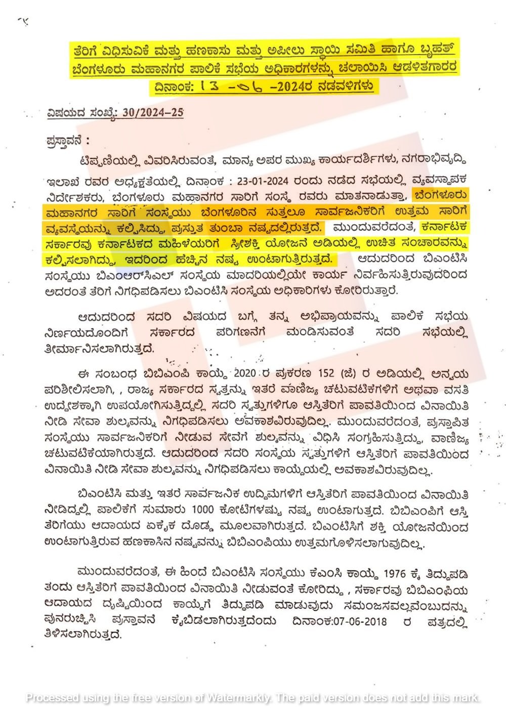 ‘ಬೆಂಗಳೂರು ಮಹಾನಗರ ಸಾರಿಗೆ ಸಂಸ್ಥೆಯು ಬೆಂಗಳೂರಿನ ಸುತ್ತಲೂ ಸಾರ್ವಜನಿಕರಿಗೆ ಉತ್ತಮ ಸಾರಿಗೆ ವ್ಯವಸ್ಥೆಯನ್ನು ಕಲ್ಪಿಸಿದೆ. ಪ್ರಸ್ತುತ ತುಂಬಾ ನಷ್ಟದಲ್ಲಿದೆ. ಮುಂದುವರೆದಂತೆ ಕರ್ನಾಟಕ ಸರ್ಕಾರವು ಕರ್ನಾಟಕ ಮಹಿಳೆಯರಿಗೆ ಸ್ತ್ರೀ ಶಕ್ತಿ ಯೋಜನೆ ಅಡಿಯಲ್ಲಿ ಉಚಿತ ಸಂಚಾರವನ್ನು ಕಲ್ಪಿಸಲಾಗಿದೆ. ಇದರಿಂದ ಹೆಚ್ಚಿನ ನಷ್ಟವುಂಟಾಗುತ್ತಿರುತ್ತದೆ,’ ಎಂದು 2024ರ ಜೂನ್ 13ರಂದು ನಡೆದಿದ್ದ ಸಭೆಯಲ್ಲಿ ಬಿಎಂಟಿಸಿ ವ್ಯವಸ್ಥಾಪಕ ನಿರ್ದೇಶಕರು ಹೇಳಿದ್ದರು.