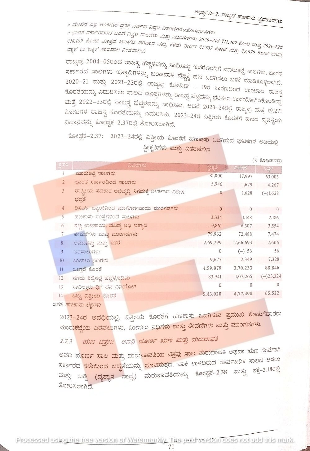 ಮಾರುಕಟ್ಟೆ ಸಾಲ 63,003 ಕೋಟಿಯಷ್ಟಿತ್ತು. ಭಾರತ ಸರ್ಕಾರದಿಂದ 4,267 ಕೋಟಿ, ಹಣಕಾಸು ಸಂಸ್ಥೆಗಳಿಂದ 2,186 ಕೋಟಿ, ಸಣ್ಣ ಉಳಿತಾಯ, ಭವಿಷ್ಯ ನಿಧಿ ಇತ್ಯಾದಿಗಳಿಂದ 3,554 ಕೋಟಿ , ಠೇವಣಿಗಳು ಮತ್ತು ಮುಂಗಡಗಳಿಂದ 7,474 ಕೋಟಿ, ಇರು ಸಾಲಗಳು 56 ಕೋಟಿ, ಮೀಸಲು ನಿಧಿಗಳಿಂದ 7,328 ಕೋಟಿಯಷ್ಟು ಸಾಲವನ್ನು ಪಡೆದಿತ್ತು.