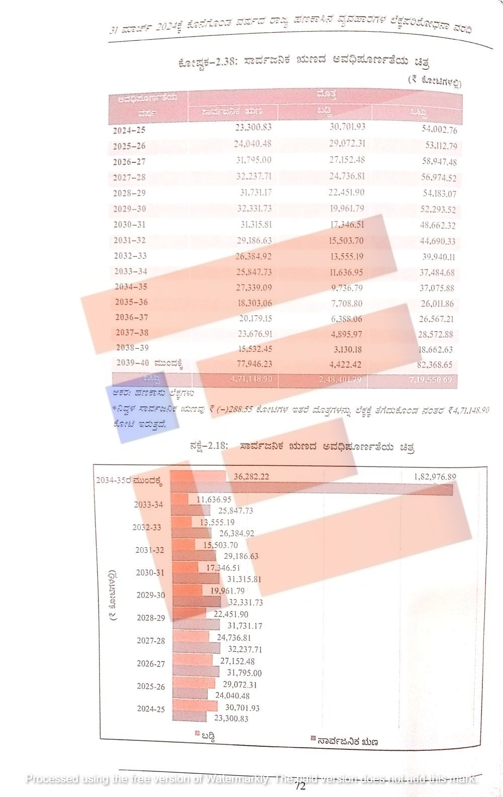 2024-25ರಲ್ಲಿ ಸಾರ್ವಜನಿಕ ಋಣವು 23,300.83 ಕೋಟಿ, ಬಡ್ಡಿ 30,701.93 ಕೋಟಿ ಸೇರಿ 54,002.76 ಕೋಟಿಯಷ್ಟಿದೆ. 2025-26ರಲ್ಲಿ ಒಟ್ಟಾರೆ 53,112.79 ಕೋಟಿ, 2026-27ರಲ್ಲಿ 58,947.48 ಕೋಟಿ, 2027-28ರಲ್ಲಿ 56,974.52 ಕೋಟಿ, 2028-29ರಲ್ಲಿ 54,183.07 ಕೋಟಿ, 2029-30ರಲ್ಲಿ 52,293.52 ಕೋಟಿ, 2030-31ರಲ್ಲಿ 48,662.32 ಕೋಟಿ, 2031-32ರಲ್ಲಿ 44,690.33 ಕೋಟಿ, 2032-33ರಲ್ಲಿ 39,940.11 ಕೋಟಿ, 2033-34ರಲ್ಲಿ 37,940.68 ಕೋಟಿ, 2034-35ರಲ್ಲಿ 37,075.88 ಕೋಟಿ, 2035-36ರಲ್ಲಿ 26,011.86 ಕೋಟಿ, 2036-37ರಲ್ಲಿ 26,567.21 ಕೋಟಿ, 2037-38ರಲ್ಲಿ 28,572.88 ಕೋಟಿ, 2038-39ರಲ್ಲಿ 18,662 ಕೋಟಿ 2039-40ಕ್ಕೆ 82,368.65 ಕೋಟಿ ಇರಲಿದೆ ಎಂದು ಸಿಎಜಿಯು ಸಾರ್ವಜನಿಕ ಋಣದ ಚಿತ್ರಣವನ್ನು ಒದಗಿಸಿದೆ.