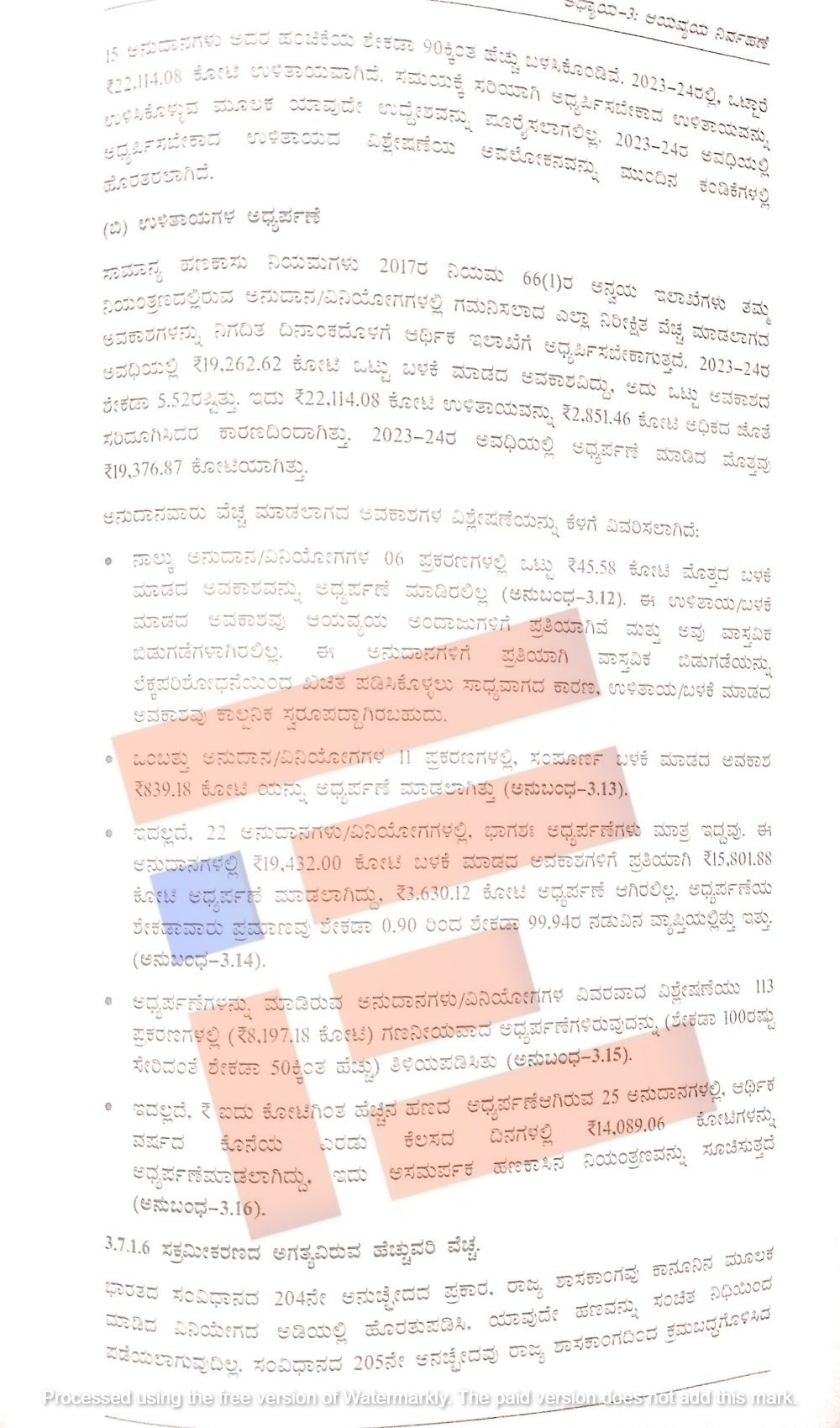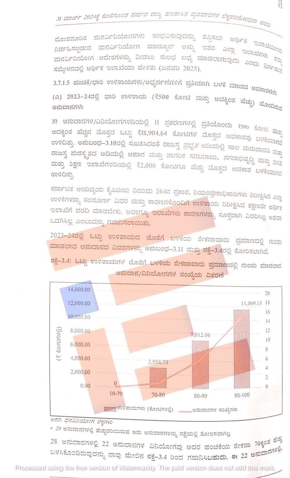 2024ರ ಮಾರ್ಚ್ 31ರ ಅಂತ್ಯಕ್ಕೆ ರಾಜ್ಯ ಹಣಕಾಸಿನ ವ್ಯವಹಾರಗಳ ಲೆಕ್ಕ ಪರಿಶೋಧನೆ ವರದಿಯಲ್ಲಿ ಇಲಾಖೆಗಳು ಮಾಡಿರುವ ಉಳಿತಾಯದ ಹಣದ ಕುರಿತು ವಿಶ್ಲೇಷಣೆ ಮಾಡಿದೆ.