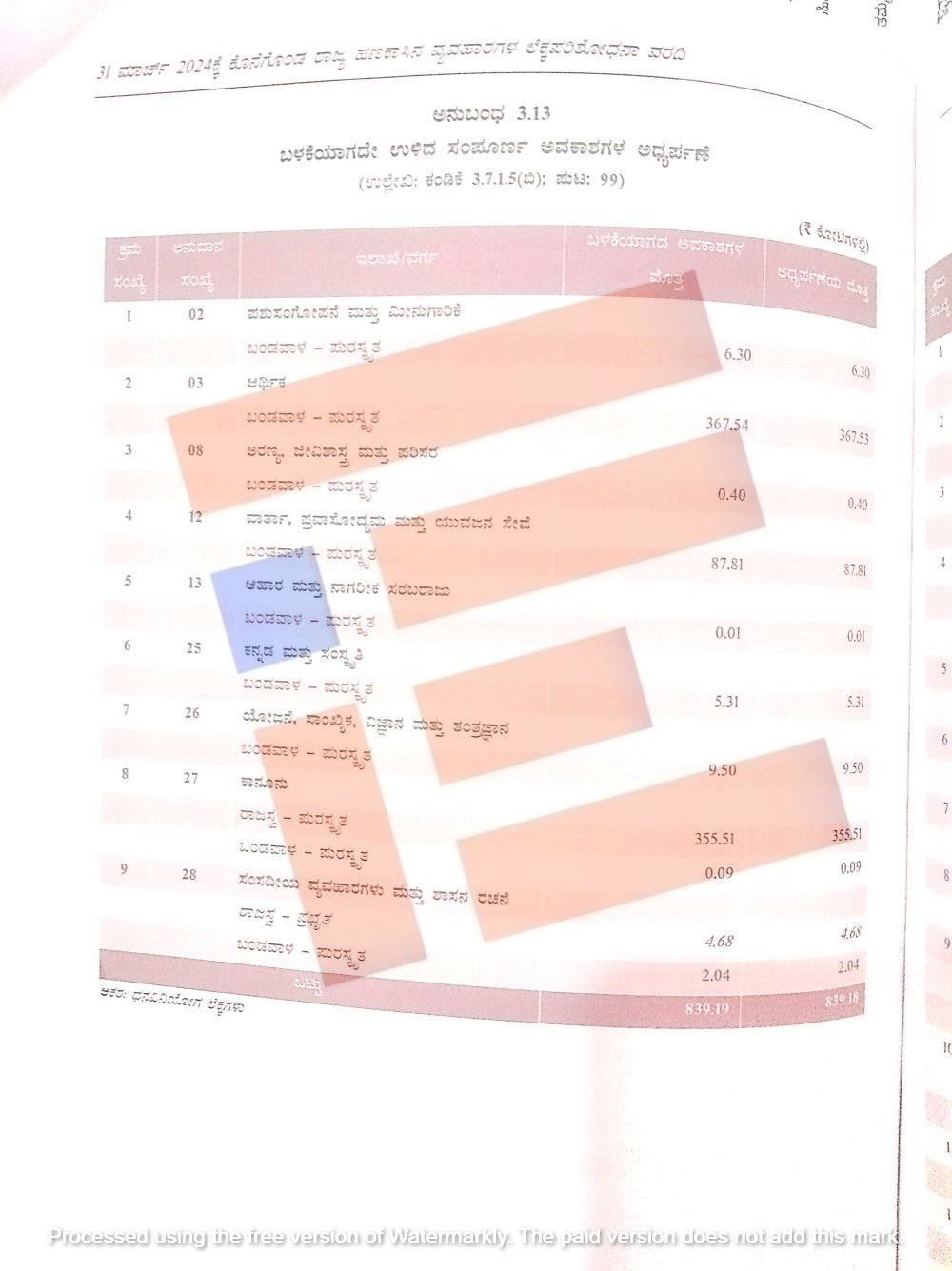ಪಶು ಸಂಗೋಪನೆ ಮತ್ತು ಮೀನುಗಾರಿಕೆಯಲ್ಲಿ 6.30 ಕೋಟಿ, ಆರ್ಥಿಕ ಇಲಾಖೆ 367.53 ಕೋಟಿ, ಅರಣ್ಯ ಜೀವಿಶಾಸ್ತ್ರ ಪರಿಸರ ಇಲಾಖೆ 0.40 ಕೋಟಿ, ವಾರ್ತಾ, ಪ್ರವಾಸೋದ್ಯಮ ಯುವಜನ ಸೇವೆ 87.81 ಕೋಟಿ, ಆಹಾರ ನಾಗರೀಕ ಸರಬರಾಜು ಇಲಾಖೆ 0.01 ಕೋಟಿ, ಕನ್ನಡ ಸಂಸ್ಕೃತಿ 5.31 ಕೋಟಿ, ಯೋಜನೆ, ಸಾಂಖ್ಯಿಕ, ವಿಜ್ಞಾನ ತಂತ್ರಜ್ಞಾನ 9.50 ಕೋಟಿ, ಕಾನೂನು 355.51 ಕೋಟಿ, ಸಂಸದೀಯ ವ್ಯವಹಾರಗಳು ಶಾಸನ ರಚನೆ 4.68 ಕೋಟಿ ರು ಸೇರಿ 839.18 ಕೋಟಿ ಉಳಿಕೆಯಾಗಿತ್ತು.