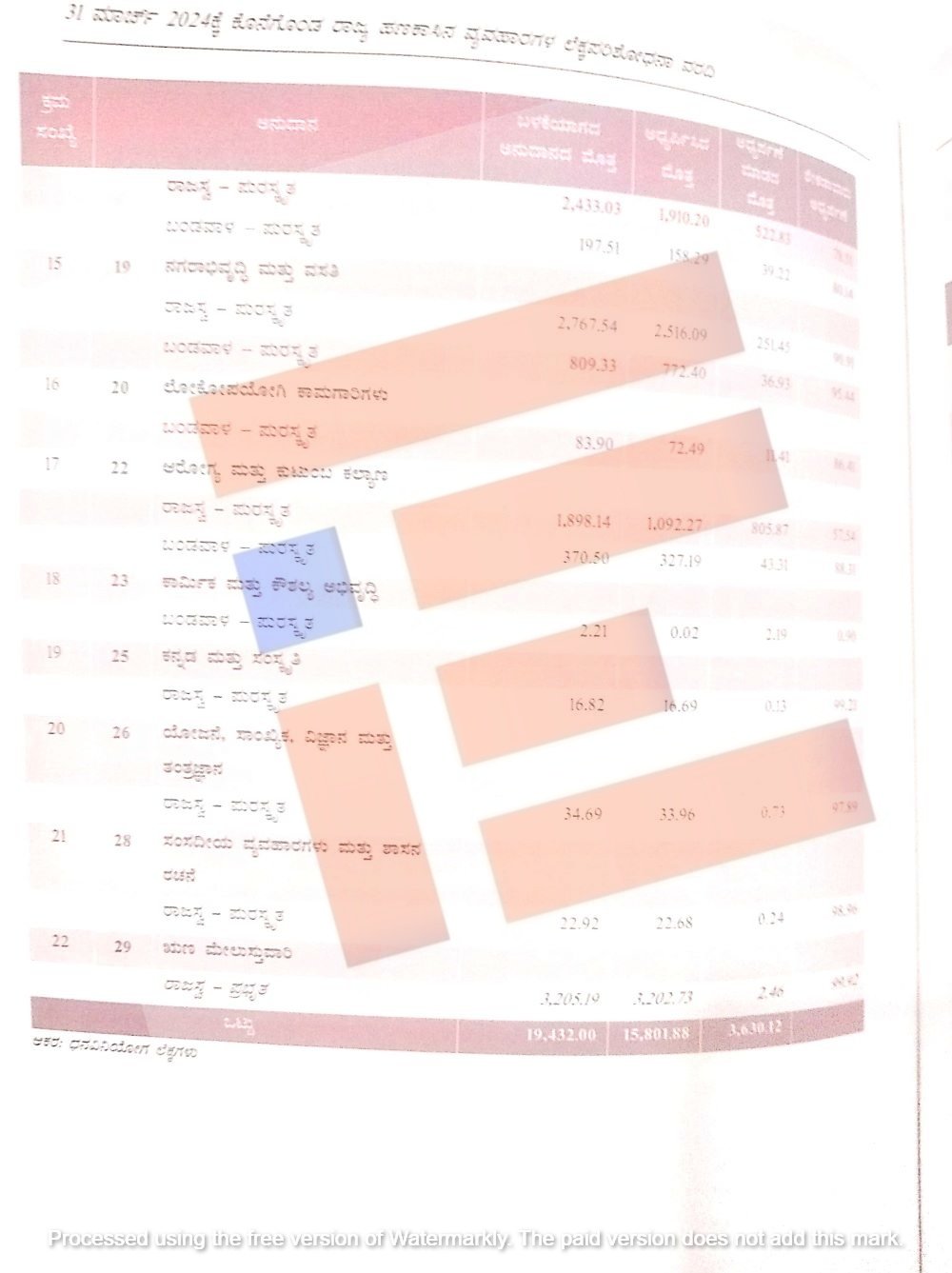 ಒಳಾಡಳಿತ ಮತ್ತು ಸಾರಿಗೆ ಇಲಾಖೆಯು 979.72 ಕೋಟಿ, ಗ್ರಾಮೀಣಾಭಿವೃದ್ಧಿ ಮತ್ತು ಪಂಚಾಯತ್ರಾಜ್ 1,234.65 ಕೋಟಿ, ಸಮಾಜ ಕಲ್ಯಾಣ ಇಲಾಖೆ 504.55 ಕೋಟಿ, ಮಹಿಳಾ ಮತ್ತು ಮಕ್ಕಳ ಅಭಿವೃದ್ಧಿ 1,325.30 ಕೋಟಿ, ಆಹಾರ ಮತ್ತು ನಾಗರೀಕ ಸರಬರಾಜು 2,958.72 ಕೋಟಿ, ಕಂದಾಯ 788.47 ಕೋಟಿ, ಶಿಕ್ಷಣ 2,433.03 ಕೋಟಿ, ನಗರಾಭಿವೃದ್ಧಿ , ವಸತಿ ಇಲಾಖೆ 2,767.54 ಕೋಟಿ, ಆರೋಗ್ಯ ಮತ್ತು ಕುಟುಂಬ ಕಲ್ಯಾಣ ಇಲಾಖೆ 1,898.14 ಕೋಟಿಯನ್ನು ಉಳಿತಾಯ ಮಾಡಿತ್ತು.