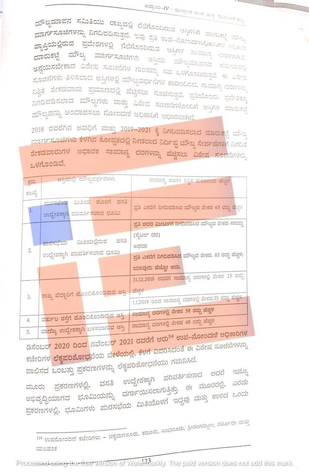ಮಾರ್ಗಸೂಚಿಗಳ ವಿಶೇಷ ಸೂಚನೆ ಪ್ರಕಾರ ಪುರಸಭೆಯ ಮಿತಿಯ ಹೊರಗೆ ಇರುವ ಭೂಮಿಗೆ ಸಾಮಾನ್ಯ ಕೃಷಿ ದರಗಳನ್ನು ಶೇ.65ರಷ್ಟು ಹೆಚ್ಚಿಸಬೇಕಾಗಿತ್ತು. ಮತ್ತು ಪುರಸಭೆ ಮಿತಿಯೊಳಗೆ ಇರುವ ಭೂಮಿಗೆ, ವರ್ಗಾಯಿಸಲಾಗುವ ಆಸ್ತಿಯ ಮೌಲ್ಯವನ್ನು ಅಂದಾಜು ಮಾಡಲು ಕೃಷಿ ದರಗಳನ್ನು ಶೇ.65ರಷ್ಟು ಅಥವಾ ಜಾಗದ ದರಗಳು ಶೇ. 40ರಷ್ಟು ಇವುಗಳಲ್ಲಿ ಹೆಚ್ಚಿನದನ್ನು ಬಳಸಿ ಮೌಲ್ಯಮಾಪನ ಮಾಡಬೇಕಾಗಿತ್ತು.