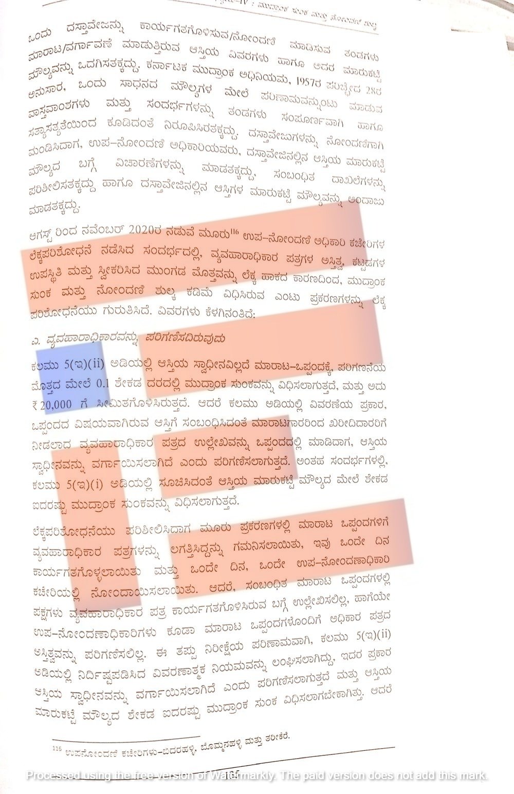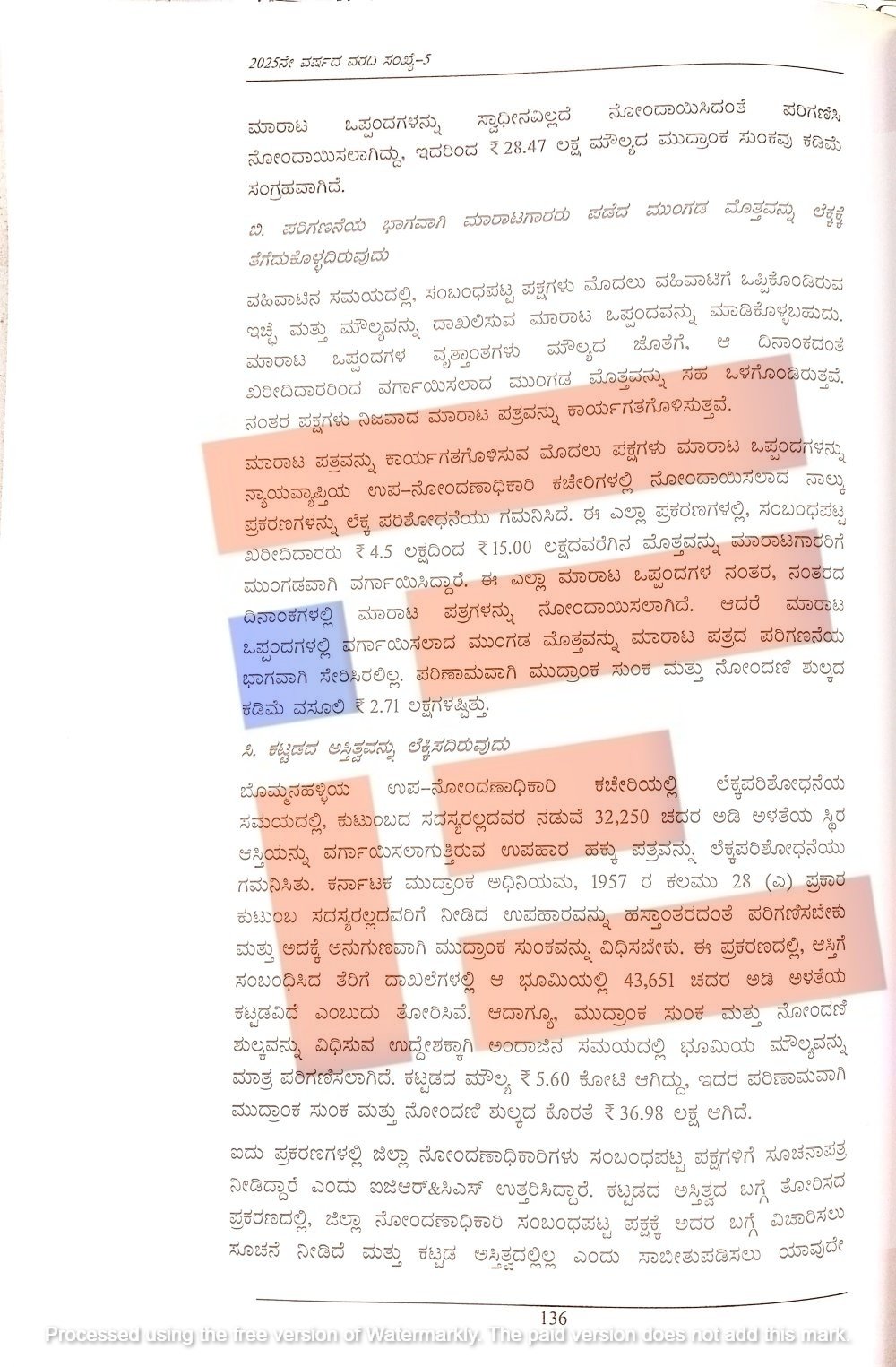 ಮಹದೇವಪುರ ಮತ್ತು ನೆಲಮಂಗಲದ ಉಪ ನೋಂದಣಿ ಕಚೇರಿಗಳ ಲೆಕ್ಕ ಪರಿಶೋಧನೆಯ ಸಮಯದಲ್ಲಿ ಪ್ರತಿ ಕಚೇರಿಯಲ್ಲಿ ಜಂಟಿ ಅಭಿವೃದ್ದಿ ಒಪ್ಪಂದಗಳನ್ನು ಸ್ವಾಧೀನವಿಲ್ಲದೇ ಮಾರಾಟ ಒಪ್ಪಂದವಾಗಿ ನೋಂದಾಯಿಸಿರುವ ಪ್ರಕರಣಗಳನ್ನು ಪತ್ತೆ ಹಚ್ಚಿದೆ.