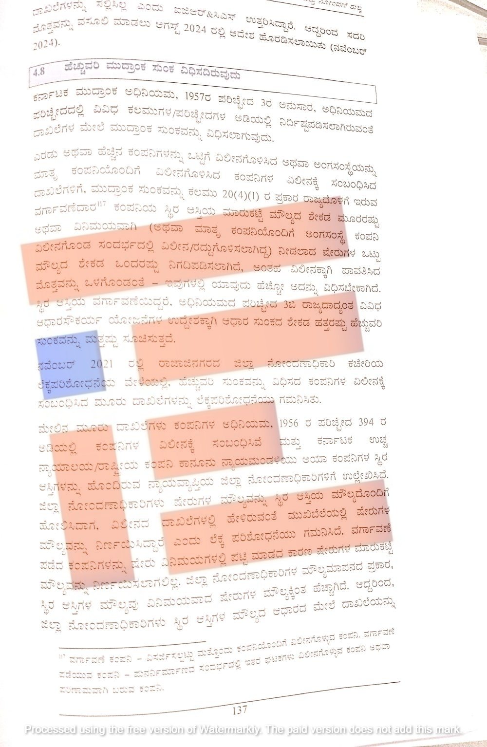 ಜಿಲ್ಲಾ ನೋಂದಣಾಧಿಕಾರಿಗಳ ಮೌಲ್ಯಮಾಪನದ ಪ್ರಕಾರ ಸ್ಥಿರ ಆಸ್ತಿಗಳ ಮೌಲ್ಯವು ವಿನಿಮಯವಾದ ಷೇರುಗಳ ಮೌಲ್ಯಕ್ಕಿಂತ ಹೆಚ್ಚಾಗಿದೆ. ಜಿಲ್ಲಾ ನೋಂದಣಾಧಿಕಾರಿಗಳು ಸ್ಥಿರ ಆಸ್ತಿಗಳ ಮೌಲ್ಯದ ಆಧಾರದ ಮೇಲೆ ದಾಖಲೆಯನ್ನು 439.17 ಕೋಟಿಗೆ ಮೌಲ್ಯಮಾಪನ ಮಾಡಿದರು. ಮತ್ತು 13.17 ಕೋಟಿ ಮುದ್ರಾಂಕ ಸುಂಕವನ್ನು ವಿಧಿಸಿದ್ದರು.