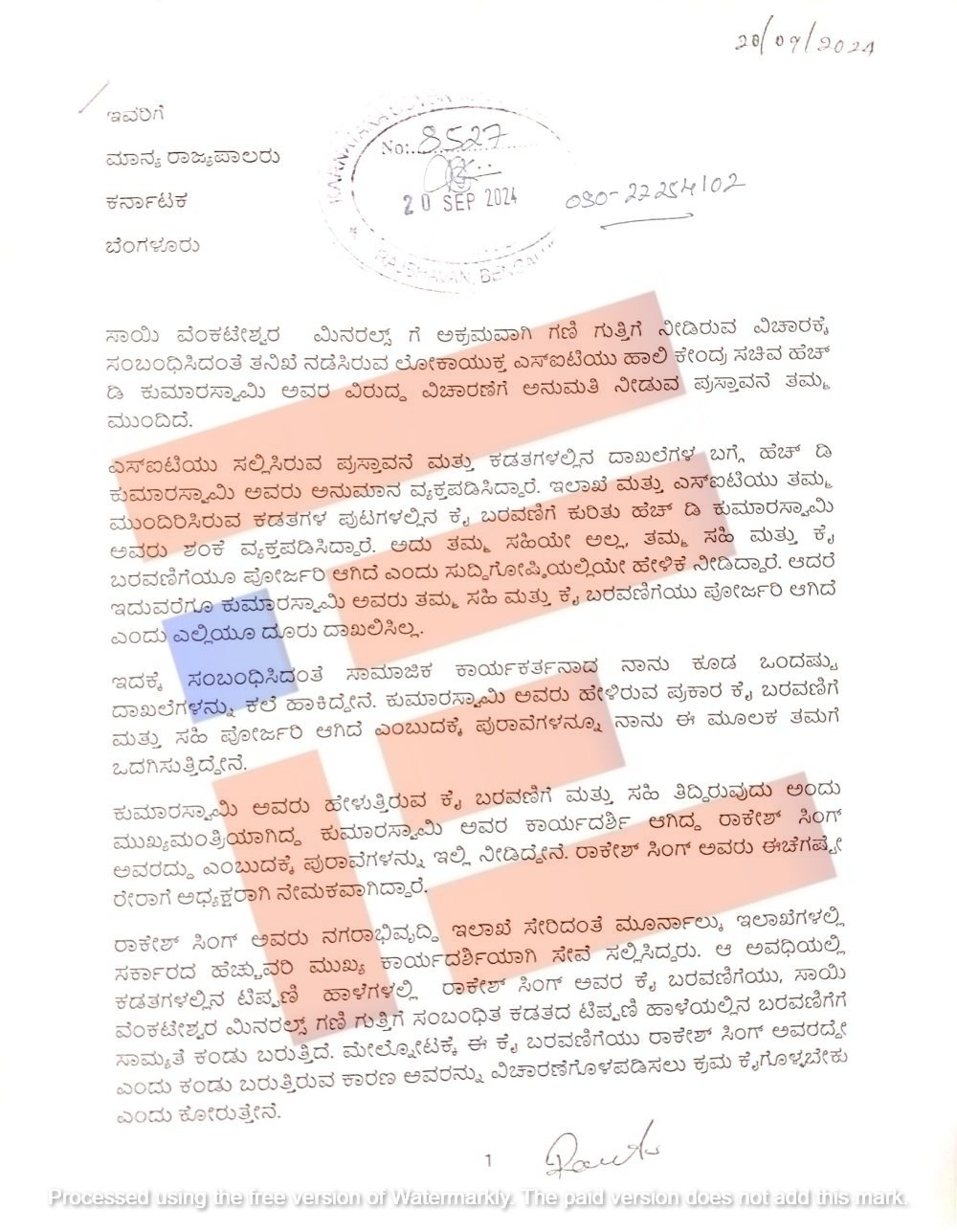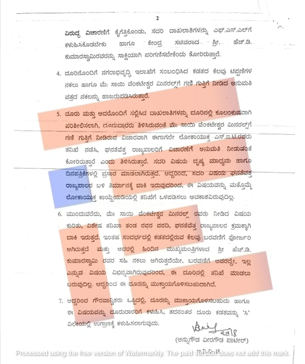 ರಾಜ್ಯಪಾಲರ ಬಳಿ ಈ ವಿಷಯವು ಇನ್ನೂ ಇತ್ಯರ್ಥವಾಗದೇ ಬಾಕಿ ಇರುವ ಈ ಸಂದರ್ಭದಲ್ಲಿ ಕಡತದಲ್ಲಿರುವ ಕೆಲವು ಬರವಣಿಗೆಗಳು ಫೋರ್ಜರಿ ಆಗಿರುತ್ತದೆ ಮತ್ತು ಅದರಲ್ಲಿ ಹಿಂದಿನ ಮುಖ್ಯಮಂತ್ರಿ ಕುಮಾರಸ್ವಾಮಿ ಅವರ ಸಹಿ ನಕಲು ಆಗಿರುತ್ತದೆಯೇ,  ಬರವಣಿಗೆ ಅವರದ್ದೇ, ಇಲ್ಲ ಎನ್ನುವ ವಿಷಯವು ವಿಭಿನ್ನವಾಗಿದೆ. ಹೀಗಾಗಿ ಈ ದೂರಿನಲ್ಲಿ ತನಿಖೆ ಮಾಡಲು ಬರುವುದಿಲ್ಲ.  ಆದ್ದರಿಂದ  ಈ ದೂರನ್ನು ಮುಕ್ತಾಯಗೊಳಿಸಬಹುದು ಎಂದು ಲೋಕಾಯುಕ್ತ ಸಂಸ್ಥೆಯ ಹೆಚ್ಚುವರಿ ನಿಬಂಧಕರು ಲೋಕಾಯುಕ್ತರಿಗೆ ವರದಿ ಸಲ್ಲಿಸಿದ್ದರು.