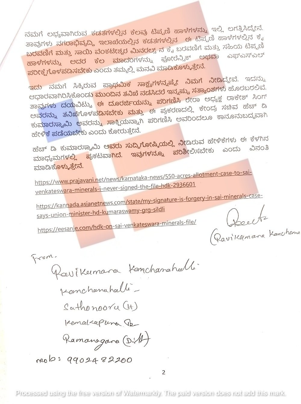ಕುಮಾರಸ್ವಾಮಿ ಅವರು ಹೇಳುತ್ತಿರುವ ಕೈ ಬರವಣಿಗೆ ಮತ್ತು ಸಹಿ ತಿದ್ದಿರುವುದು ಅಂದು ಮುಖ್ಯಮಂತ್ರಿಯಾಗಿದ್ದ ಕುಮಾರಸ್ವಾಮಿ ಅವರ ಕಾರ್ಯದರ್ಶಿ ಆಗಿದ್ದ ರಾಕೇಶ್‌ ಸಿಂಗ್‌ ಅವರದ್ದು ಎಂಬುದಕ್ಕೆ ಪುರಾವೆಗಳನ್ನು ಇಲ್ಲಿ ನೀಡಿದ್ದೇನೆ.