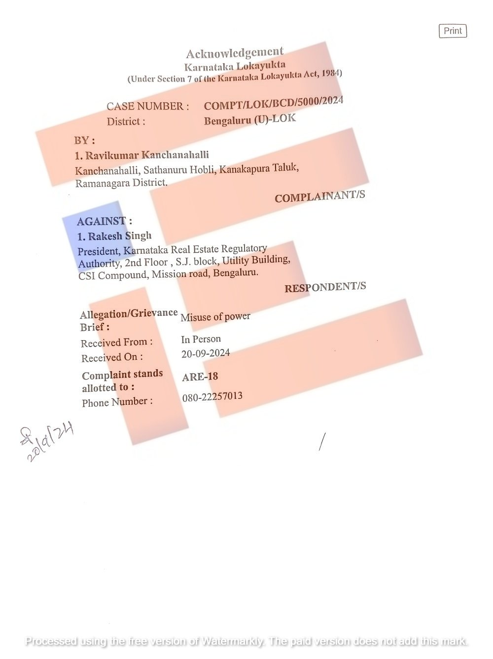 ಈ ಹೇಳಿಕೆ ಆಧರಿಸಿ ಸಾಮಾಜಿಕ ಕಾರ್ಯಕರ್ತ ರವಿಕುಮಾರ್ ಕಂಚನಹಳ್ಳಿ ಅವರು ಲೋಕಾಯುಕ್ತಕ್ಕೆ 2024ರ ಸೆ.20ರಂದು ಸಹಿ ಮತ್ತು ಕೈ ಬರವಣಿಗೆಯ ಮಾದರಿಗಳ ಸಮೇತ   ದೂರು ಸಲ್ಲಿಸಿದ್ದರು. ಈ ದೂರನ್ನು ಸ್ವೀಕರಿಸಿದ್ದ ಲೋಕಾಯುಕ್ತ ಸಂಸ್ಥೆಯು ಪ್ರಾಥಮಿಕ ಪರಿಶೀಲನೆಯಲ್ಲಿಯೇ ದೂರನ್ನು 2025ರ ಸೆ.3ರಂದೇ  ಮುಕ್ತಾಯಗೊಳಿಸಿದೆ.  ಈ ಕುರಿತು ದೂರುದಾರ ರವಿಕುಮಾರ್‍‌ ಕಂಚನಹಳ್ಳಿ  ಅವರಿಗೆ 2025ರ ಸೆ. 19ರಂದು ಹಿಂಬರಹವನ್ನೂ ನೀಡಿದೆ.