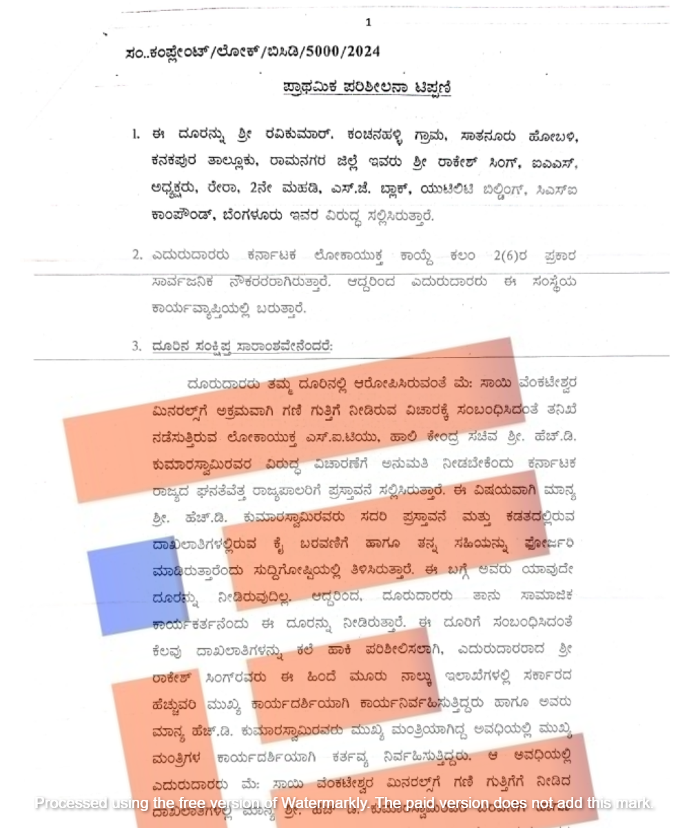 ಸಾಮಾಜಿಕ ಕಾರ್ಯಕರ್ತ ರವಿಕುಮಾರ್‍‌ ಕಂಚನಹಳ್ಳಿ   ಸಲ್ಲಿಸಿರುವ ದೂರರ್ಜಿ ಮತ್ತು ಕೈ ಬರವಣಿಗೆಗೆ ಸಂಬಂಧಿಸಿದಂತೆ  ಟಿಪ್ಪಣಿಯ ಹಾಳೆಗಳನ್ನು ಲೋಕಾಯುಕ್ತರಿಗೆ ಸಲ್ಲಿಸಿದ್ದರು.