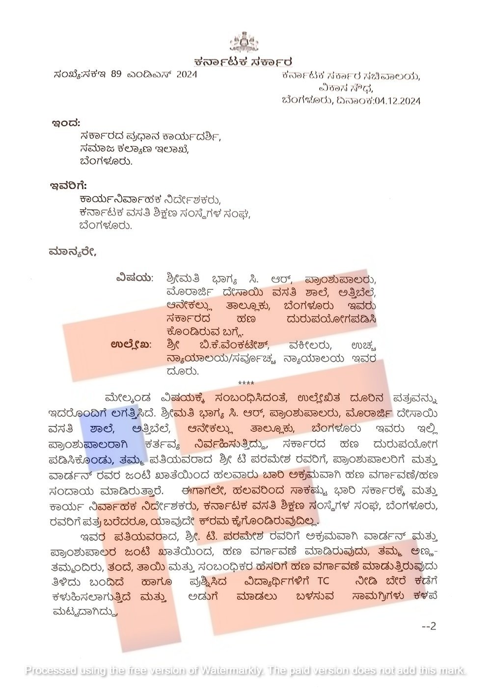 ಆನೇಕಲ್‌ ತಾಲೂಕು ಅತ್ತಿಬೆಲೆಯಲ್ಲಿರುವ ಮೊರಾರ್ಜಿ ದೇಸಾಯಿ ವಸತಿ ಶಾಲೆಯ ಪ್ರಾಂಶುಪಾಲರಾದ ಭಾಗ್ಯ ಸಿ ಆರ್ ಎಂಬುವರು ಸರ್ಕಾರದ ಹಣ ದುರುಪಯೋಗಪಡಿಸಿಕೊಳ್ಳುತ್ತಿದ್ದಾರೆ. ತಮ್ಮ ಪತಿ ಟಿ ಪರಮೇಶ್‌ ಅವರಿಗೆ ಪ್ರಾಂಶುಪಾಲರು ಮತ್ತು ವಾರ್ಡನ್‌ ಅವರ ಜಂಟಿ ಖಾತೆಯಿಂದ ಹಲವಾರು ಬಾರಿ ಅಕ್ರಮವಾಗಿ ಹಣ ವರ್ಗಾವಣೆ ಆಗಿದೆ. ಈಗಾಗಲೇ ಹಲವರಿಂದ ಸಾಕಷ್ಟು ಬಾರಿ ಸರ್ಕಾರಕ್ಕೆ ಮತ್ತು ಕ್ರೈಸ್‌ನ ಕಾರ್ಯನಿರ್ವಾಹಕ ನಿರ್ದೇಶಕರಿಗೆ ದೂರು ನೀಡಲಾಗಿದೆ. ಆದರೆ ಯಾರೂ ಕ್ರಮ ಕೈಗೊಂಡಿಲ್ಲ ಎಂದು ವಕೀಲ ವೆಂಕಟೇಶ್‌ ಎಂಬುವರು ದೂರಿನಲ್ಲಿ ಉಲ್ಲೇಖಿಸಿದ್ದ ಅಂಶಗಳನ್ನು ಪತ್ರದಲ್ಲಿ ಪ್ರಸ್ತಾವಿಸಿರುವುದು ಗೊತ್ತಾಗಿದೆ.