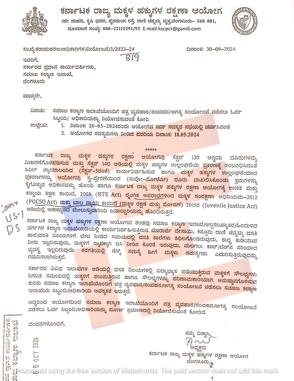 ಹೀಗೆಂದು 2024ರ ಸೆ 30ರಂದೇ ಕರ್ನಾಟಕ ರಾಜ್ಯ ಮಕ್ಕಳ ಹಕ್ಕುಗಳ ರಕ್ಷಣಾ ಆಯೋಗವು ಸರ್ಕಾರಕ್ಕೆ ಬರೆದಿರುವ ಪತ್ರದಲ್ಲಿ ವಸತಿ ಶಾಲೆಗಳ ನೈಜ ಸ್ಥಿತಿಯನ್ನು ಅನಾವರಣಗೊಳಿಸಿತ್ತು. ಆಯೋಗವು ವರ್ಷದ ಹಿಂದೆಯೇ ನೀಡಿದ್ದ ವರದಿಯ  ಪ್ರತಿಯು ‘ದಿ ಫೈಲ್‌’ಗೆ ಲಭ್ಯವಾಗಿದೆ.