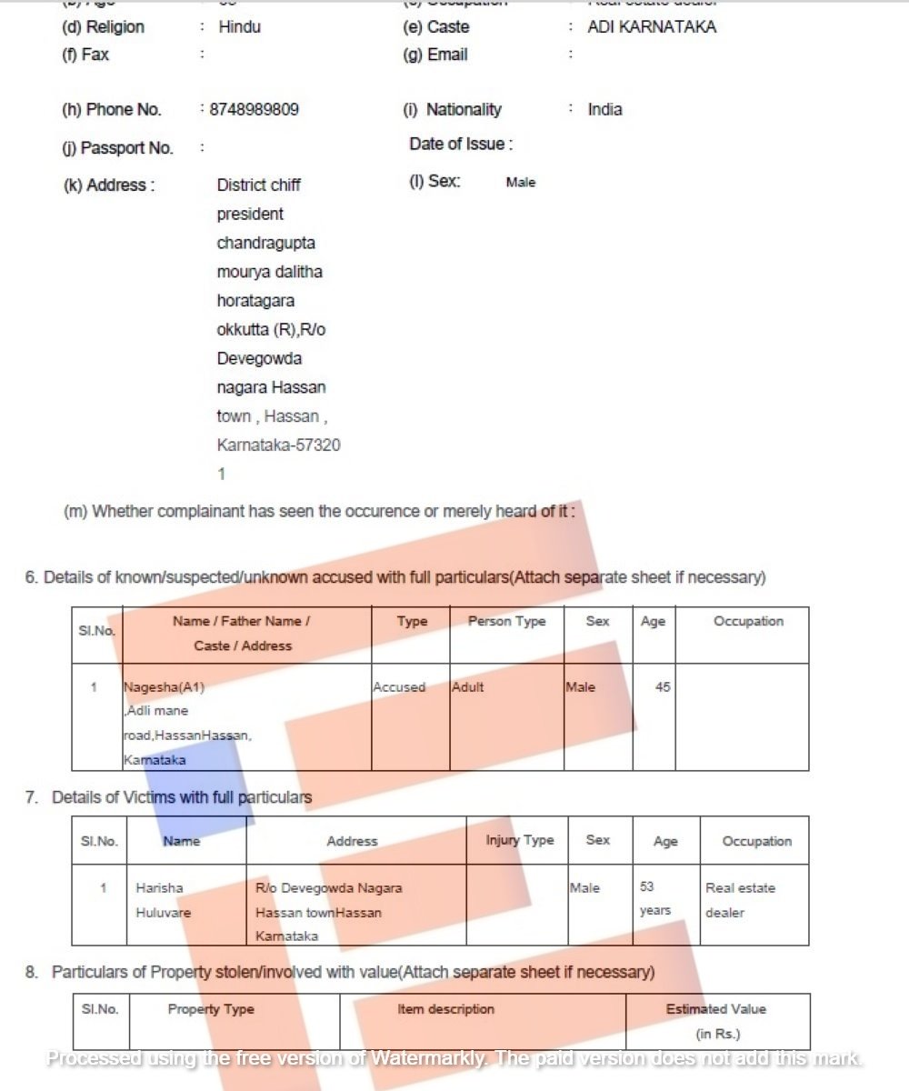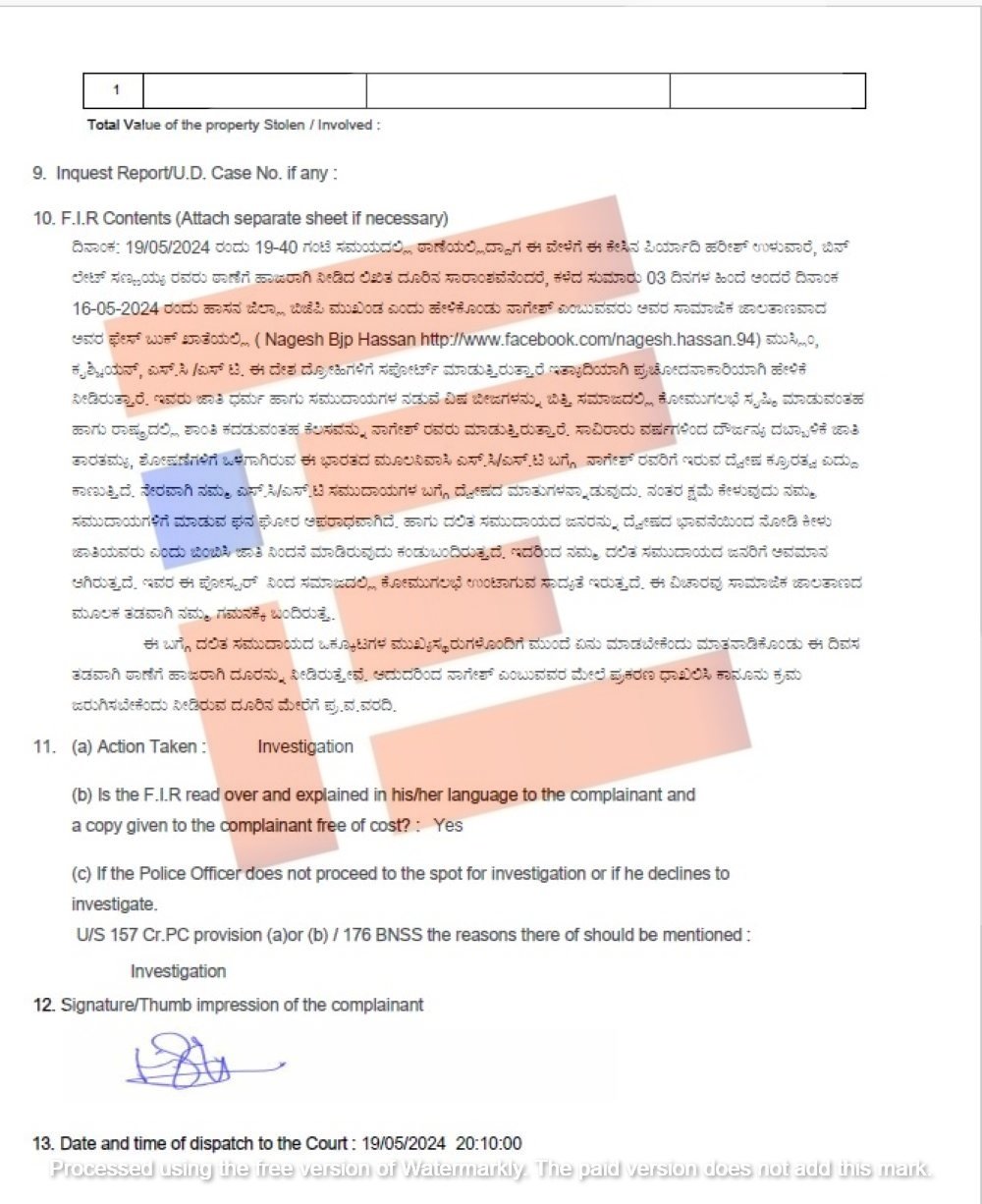 ಹಾಸನ ಜಿಲ್ಲಾ ಬಿಜೆಪಿ ಮುಖಂಡ ಎಂದು ಹೇಳಿಕೊಂಡು ನಾಗೇಶ್ ಎಂಬುವರು ಅವರ ಸಾಮಾಜಿಕ ಜಾಲತಾಣವಾದ ಅವರ ಫೇಸ್ ಬುಕ್ ಖಾತೆಯಲ್ಲಿ (Nagesh Bjp Hsan http;//facebook.com.hassan.94) ಮುಸ್ಲಿಂ, ಕ್ರಿಶ್ಚಿಯನ್, ಎಸ್ ಸಿ ಎಸ್ ಟಿ ಈ ದೇಶ ದ್ರೋಹಿಗಳಿಗೆ ಸಪೋರ್ಟ್ ಮಾಡುತ್ತಿದ್ದಾರೆ. ಇತ್ಯಾದಿಯಾಗಿ ಪ್ರಚೋದನಾಕಾರಿಯಾಗಿ ಹೇಳಿಕೆ ನೀಡಿರುತ್ತಾರೆ. ಇವರು ಜಾತಿ ಧರ್ಮ ಹಾಗೂ ಸಮುದಾಯಗಳ ನಡುವೆ ವಿಷ ಬೀಜಗಳನ್ನು ಬಿತ್ತಿ ಸಮಾಜದಲ್ಲಿ ಕೋಮುಗಲಭೆ ಸೃಷ್ಟಿ ಮಾಡುವಂತಹ ಹಾಗೂ ರಾಷ್ಟ್ರದಲ್ಲಿ ಶಾಂತಿ ಕದಡುವಂತಹ ಕೆಲಸವನ್ನು ನಾಗೇಶ್ ಮಾಡುತ್ತಿದ್ದಾರೆ ಎಂದು ಎಫ್ಐಆರ್ನಲ್ಲಿ ಹೇಳಲಾಗಿದೆ.