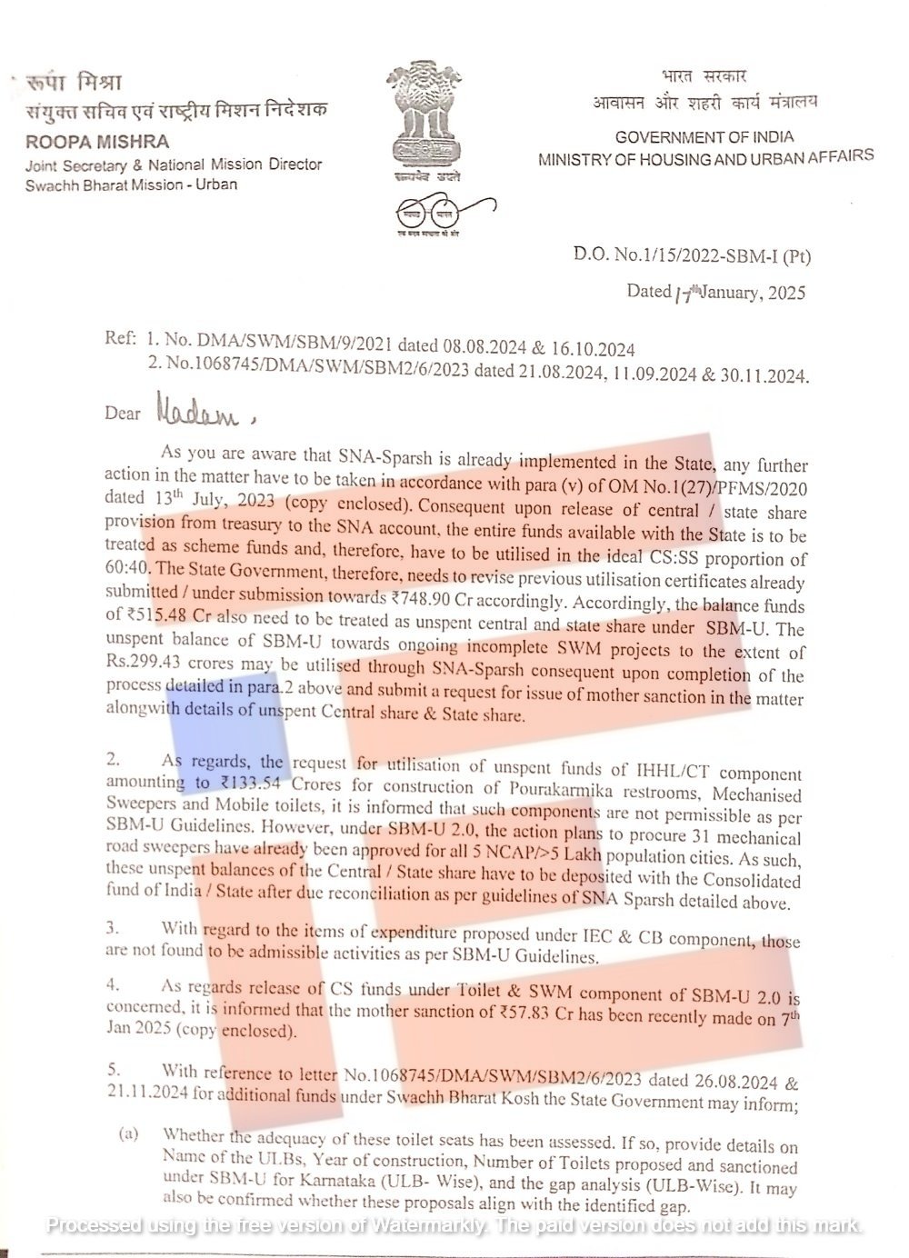 ಈ ಸಂಬಂಧ ಸ್ವಚ್ಛ ಭಾರತ್ ಮಿಷನ್ನ ಕೇಂದ್ರ ಸರ್ಕಾರದ ಜಂಟಿ ಕಾರ್ಯದರ್ಶಿ ರೂಪಾ ಮಿಶ್ರಾ ಅವರು 2025ರ ಜನವರಿ 17ರಂದು ನಗರಾಭಿವೃದ್ಧಿ ಇಲಾಖೆಯ ಸರ್ಕಾರದ ಕಾರ್ಯದರ್ಶಿ ದೀಪಾ ಚೋಳನ್ ಅವರಿಗೆ ಪತ್ರ ಬರೆದಿದ್ದಾರೆ. ಈ ಪತ್ರದಲ್ಲಿ ಕೇಂದ್ರವು ಪ್ರಸ್ತಾಪಿಸಿರುವ ಅಂಶಗಳ ಕುರಿತು ಅಧಿಕಾರಿಗಳು ಸಚಿವ ಬೈರತಿ ಸುರೇಶ್ ಅವರೊಂದಿಗೆ ಚರ್ಚಿಸಿದ್ದಾರೆ ಎಂದು ತಿಳಿದು ಬಂದಿದೆ.