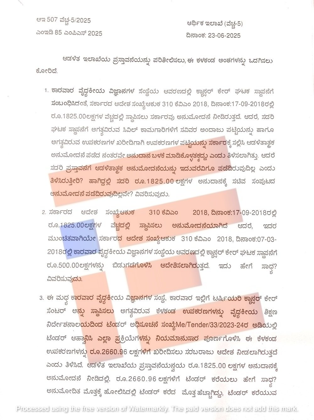 ಈ ಸಂಬಂಧ ಆರ್ಥಿಕ ಇಲಾಖೆಯು 2025ರ ಜೂನ್ 23ರಂದು ವೈದ್ಯಕೀಯ ಶಿಕ್ಷಣ ಇಲಾಖೆಯ ಸರ್ಕಾರದ ಪ್ರಧಾನ ಕಾರ್ಯದರ್ಶಿಗೆ ಪತ್ರ ಬರೆದಿದೆ. ಈ ಪತ್ರದ ಪ್ರತಿಯು ‘ದಿ ಫೈಲ್’ಗೆ ಲಭ್ಯವಾಗಿದೆ.