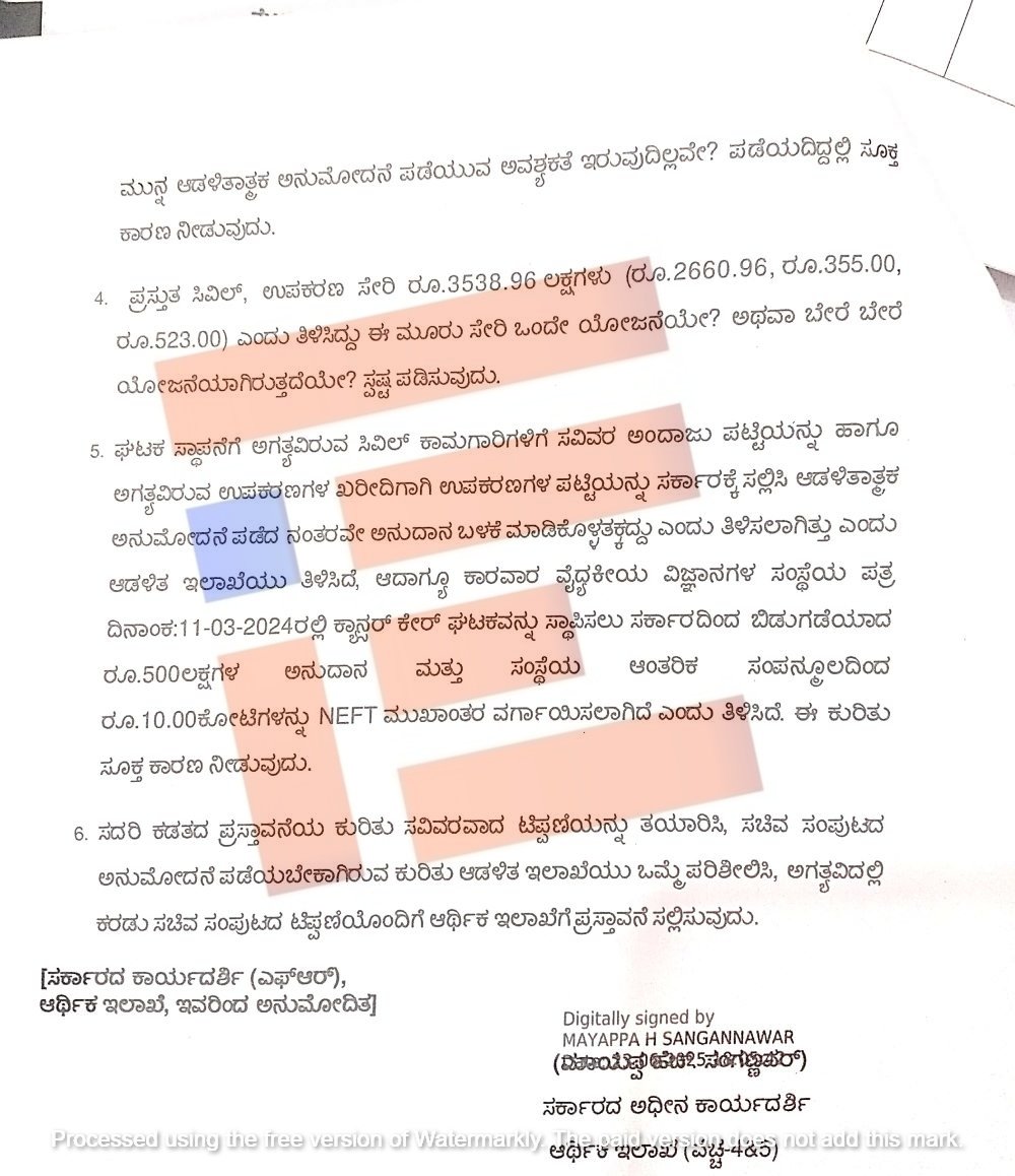 ಹಾಗೆಯೇ ಕ್ಯಾನ್ಸರ್ ಘಟಕ ಸ್ಥಾಪನೆ, ಅಗತ್ಯವಾಗಿ ಖರೀದಿಸಬೇಕಿರುವ ಉಪಕರಣಗಳ ಪಟ್ಟಿಯನ್ನು ಸರ್ಕಾರಕ್ಕೆ ಸಲ್ಲಿಸಿ, ಅನುಮೋದನೆ ಪಡೆದ ನಂತರವೇ ಅನುದಾನ ಬಳಕೆ ಮಾಡಿಕೊಳ್ಳಬೇಕು ಎಂದು ಸೂಚಿಸಿತ್ತು. ಆದರೂ ಸರ್ಕಾರದಿಂದ ಬಿಡುಗಡೆಯಾದ 5 ಕೋಟಿ ರು ಅನುದಾನ ಮತ್ತು ಸಂಸ್ಥೆಯ ಆಂತರಿಕ ಸಂಪನ್ಮೂಲದಿಂದ 10.00 ಕೋಟಿ ರು.ಗಳನ್ನು ಎನ್ಇಎಫ್ಟಿ ಮೂಲಕ ವರ್ಗಾಯಿಸಿತ್ತು ಎಂದು 2024ರ ಮಾರ್ಚ್ 11ರ ಪತ್ರದಲ್ಲಿ ತಿಳಿಸಿತ್ತು. ಇದಕ್ಕೂ ಸೂಕ್ತ ಕಾರಣ ನೀಡಬೇಕು ಎಂದು ಸೂಚಿಸಿದೆ.