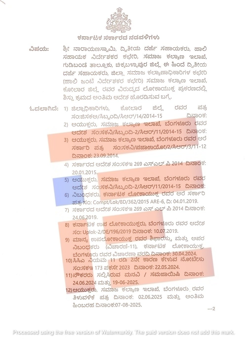 ಆದರೆ ಈ ಮಧ್ಯೆ ನಾರಾಯಣಸ್ವಾಮಿ ವಿರುದ್ಧ ಇಲಾಖೆ ವಿಚಾರಣೆ ಬಾಕಿ ಇರಿಸಿ ಅಮಾನತನ್ನು ತೆರವುಗೊಳಿಸಿತ್ತು. ಈ ಆರೋಪಿತ ನೌಕರನನ್ನು ಚಿಕ್ಕಬಳ್ಳಾಪುರ ಜಿಲ್ಲೆಯ ಗುಡಿಬಂಡೆ ತಾಲೂಕಿನ ಸಮಾಜ ಕಲ್ಯಾಣಾಧಿಕಾರಿ ಕಚೇರಿಯಲ್ಲಿ ದ್ವಿತೀಯ ದರ್ಜೆ ಸಹಾಯಕರ ಹುದ್ದೆಗೆ ಸ್ಥಳ ನಿಯುಕ್ತಿಗೊಳಿಸಿ ಆದೇಶ ಹೊರಡಿಸಲಾಗಿತ್ತು.