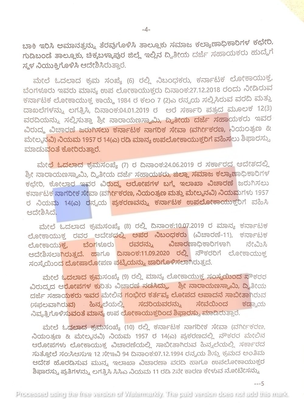 ಆಪಾದಿತ ನೌಕರ ನಾರಾಯಣಸ್ವಾಮಿ ಎಂಬಾತ ಲೋಕಾಯುಕ್ತರು ನೀಡಿದ್ದ ವರದಿಯನ್ನು ಪ್ರಶ್ನಿಸಿದ್ದ. ಅಲ್ಲದೇ ವಿಚಾರಣಾಧಿಕಾರಿಗಳ ವರದಿಯನ್ನು ಪರಿಗಣಿಸಬಾರದು ಮತ್ತು ಆರೋಪದಿಂದ ದೋಷಮುಕ್ತಗೊಳಿಸಬೇಕು ಎಂದು ಕೋರಿದ್ದ. ಆದರೆ ತನ್ನ ವಿರುದ್ಧದ ಆರೋಪಗಳನ್ನು ಅಲ್ಲಗಳೆಯಲು ಯಾವುದೇ ಪೂರಕ ದಾಖಲೆಗಳನ್ನು ಸಲ್ಲಿಸಿರಲಿಲ್ಲ. ಹೀಗಾಗಿ ಉಪ ಲೋಕಾಯುಕ್ತರ ಶಿಫಾರಸ್ಸಿನ ಅನ್ವಯ 2025ರ ಆಗಸ್ಟ್ 29ರಂದು ನಾರಾಯಣಸ್ವಾಮಿ ಎಂಬಾತನನ್ನು ಸೇವೆಯಿಂದ ಕಡ್ಡಾಯವಾಗಿ ನಿವೃತ್ತಿಗೊಳಿಸಿ ಆದೇಶ ಹೊರಡಿಸಿದೆ.