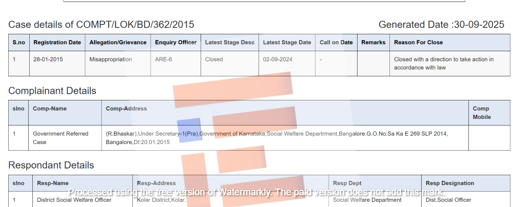 ಲೋಕಾಯುಕ್ತ ಸಂಸ್ಥೆಯು ಈ ಪ್ರಕರಣವನ್ನು 9 ವರ್ಷಗಳ ಕಾಲ ತನಿಖೆ ನಡೆಸಿ ಸರ್ಕಾರಕ್ಕೆ ವರದಿಯನ್ನು ಸಲ್ಲಿಸಿದೆ. ಈ ವರದಿ ಸಲ್ಲಿಕೆಯಾಗಿ ಒಂದು ವರ್ಷದ ಬಳಿಕ ಸಮಾಜ ಕಲ್ಯಾಣ ಇಲಾಖೆಯು ಆರೋಪಿತ ನೌಕರನನ್ನು ಅಮಾನತುಗೊಳಿಸಿದೆ.