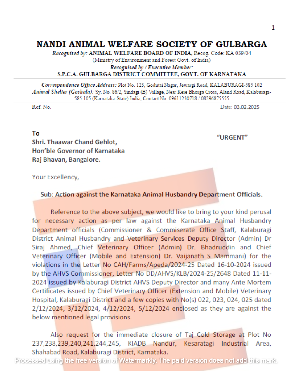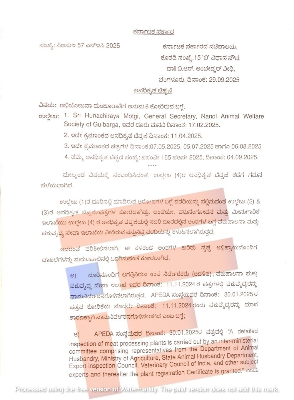 ಕಲ್ಬುರ್ಗಿಯಲ್ಲಿನ ಪ್ರಕರಣವೊಂದಕ್ಕೆ ಸಂಬಂಧಿಸಿದಂತೆ ನಿಯಮಾಗಳಿಗಳು, ಕಾಯ್ದೆ ಮತ್ತು ಅಧಿನಿಯಮಗಳ ಉಲ್ಲಂಘನೆ ಮಾಡಿರುವ ಆರೋಪದಡಿಯಲ್ಲಿ ಆಯುಕ್ತರು ಮತ್ತು ಪಶು ವೈದ್ಯಾಧಿಕಾರಿಗಳನ್ನು ವಿಚಾರಣೆಗೆ ಒಳಪಡಿಸುವ ಸಂಬಂಧ ಸಲ್ಲಿಕೆಯಾಗಿರುವ ಮನವಿಯೂ ಸೇರಿದಂತೆ ಸಮಗ್ರ ದಾಖಲೆಗಳು ‘ದಿ ಫೈಲ್’ಗೆ ಲಭ್ಯವಾಗಿವೆ.