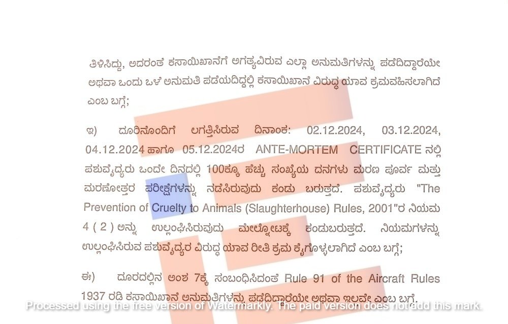 ಪಶು ವೈದ್ಯರು ಪ್ರಾಣಿಗಳ ಮೇಲಿನ ಕ್ರೌರ್ಯ ತಡೆಗಟ್ಟುವಿಕೆ (ವಧೆ) ನಿಯಮಗಳು 2001ರ 4(2)ನ್ನು ನಿರಂತರವಾಗಿ ಉಲ್ಲಂಘಿಸಿರುವುದು ಮೇಲ್ನೋಟಕ್ಕೆ ಕಂಡು ಬಂದಿದೆ. ನಿಯಮಗಳನ್ನು ಉಲ್ಲಂಘಿಸಿರುವ ಈ ಪಶು ವೈದ್ಯರ ವಿರುದ್ಧ ಯಾವ ರೀತಿ ಕ್ರಮ ಕೈಗೊಳ್ಳಲಾಗಿದೆ ಎಂಬ ಬಗ್ಗೆ ವಿವರಣೆ ನೀಡಬೇಕು ಎಂದು ನಿರ್ದೇಶಿಸಿದೆ.