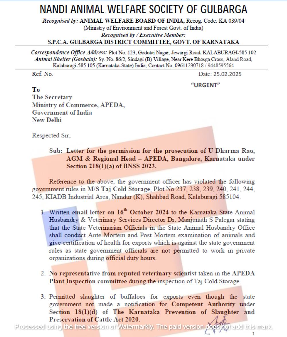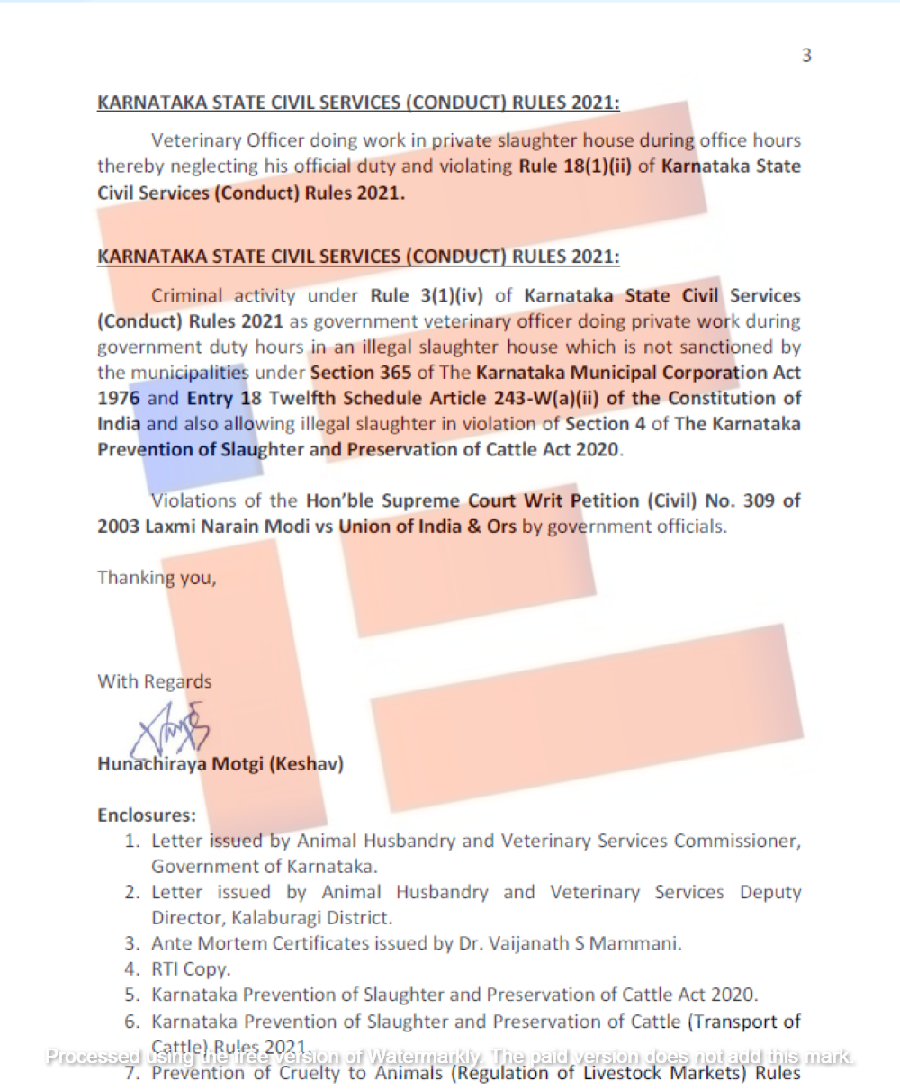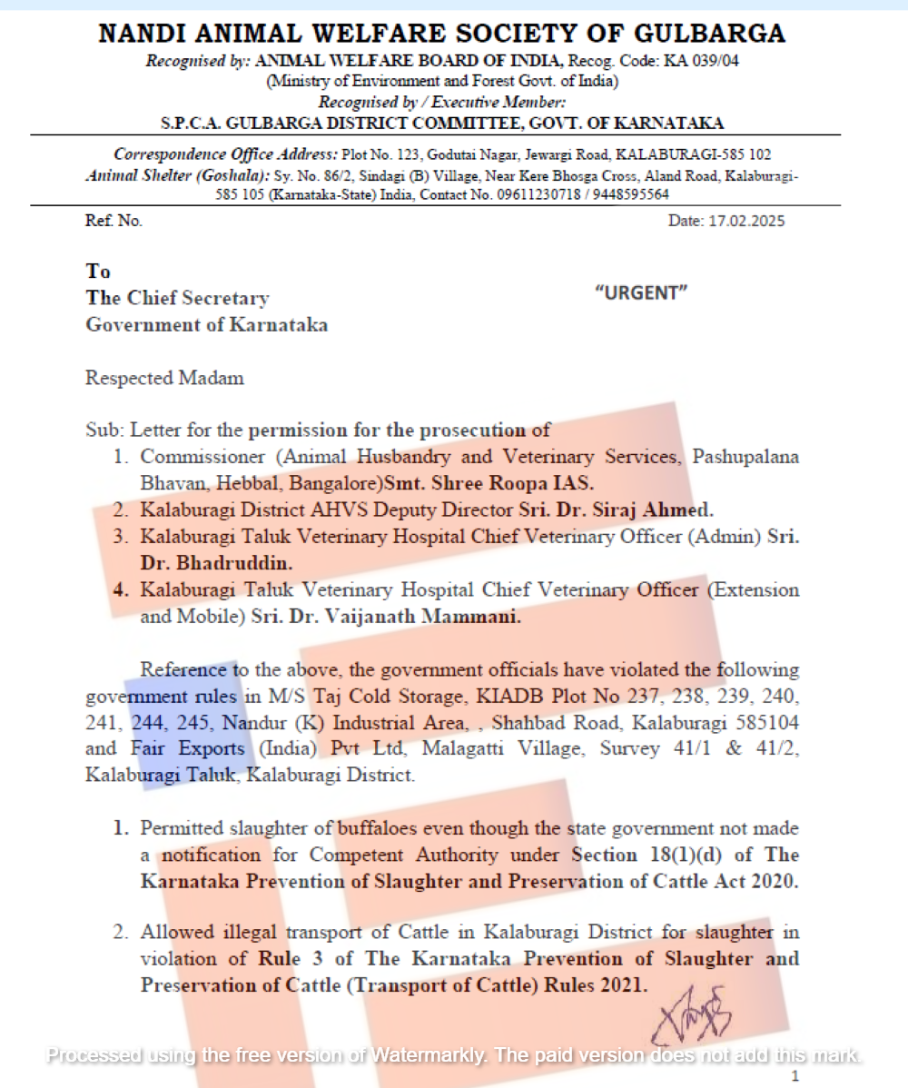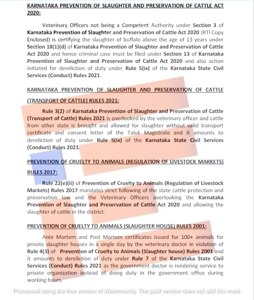 ಕರ್ನಾಟಕ ಜಾನುವಾರು ಹತ್ಯೆ ಪ್ರತಿಬಂಧಕ ಮತ್ತು ಸಂರಕ್ಷಣಾ ಅಧಿನಿಯಮ 2020 ಕಾಯ್ದೆಯನ್ನು ಉಲ್ಲಂಘಿಸಿರುವ ಪಶು ವೈದ್ಯಾಧಿಕಾರಿಗಳು ಮತ್ತು ಇಲಾಖೆಯ ಆಯುಕ್ತರ ವಿರುದ್ಧ ನಂದಿ ಪ್ರಾಣಿ ಕಲ್ಯಾಣ ಸೊಸೈಟಿಯ ಹುಣಚಿರಾಯ ಮೊಟಗಿ ಎಂಬುವರು 2025ರ ಫೆ.17ರಂದು ಸರ್ಕಾರಕ್ಕೆ ದೂರು ಸಲ್ಲಿಸಿದ್ದರು.