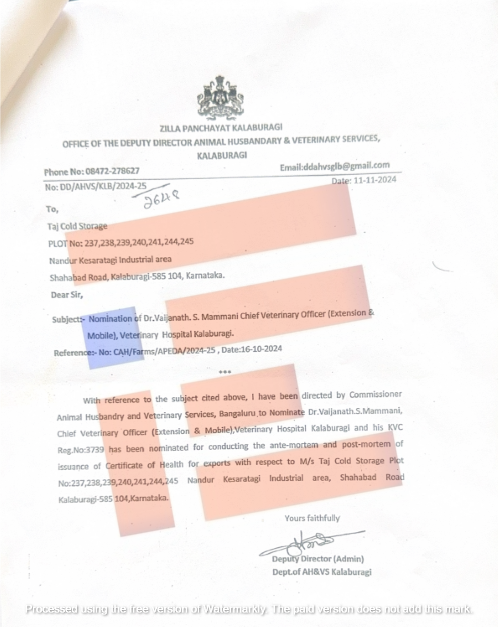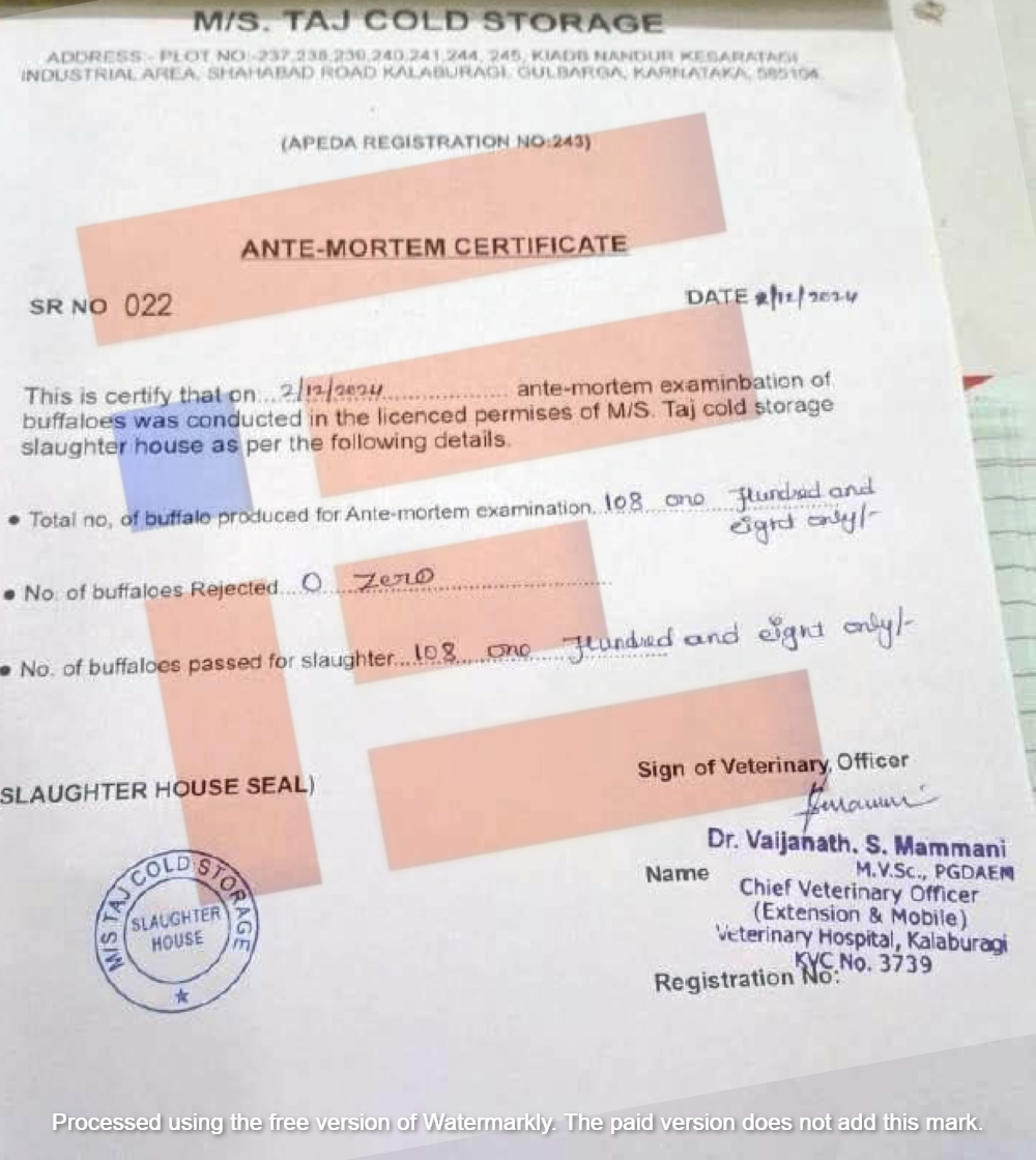 ತಾಜ್ ಕೋಲ್ಡ್ ಸ್ಟೋರೇಜ್ ಸಂಸ್ಥೆಯಲ್ಲಿ (Ante-Mortem and Post-Mortem) ಮಾಡಿ ಪ್ರಮಾಣ ಪತ್ರ ನೀಡಲು ಕಲ್ಬುರ್ಗಿಯ ಮುಖ್ಯ ಪಶು ವೈದ್ಯಾಧಿಕಾರಿ ಡಾ ವೈಜನಾಥ್ ಎಸ್ ಮಮ್ಮನಿ ಮತ್ತೊಬ್ಬ ಫೇರ್ ಎಕ್ಸ್ಪೋರ್ಟ್ ಸಂಸ್ಥೆಗೆ ಮರಣೋತ್ತರ ಮತ್ತು ಮರಣ ಪೂರ್ವ ಪ್ರಮಾಣ ಪತ್ರವನ್ನು ನೀಡಲು ನಿಮ್ಮ ಹಂತದಲ್ಲಿಯೇ ಪಶು ವೈದ್ಯಾಧಿಕಾರಿ ಡಾ ಬದ್ರುದ್ದೀನ್ ಅವರನ್ನು ಮರು ನಾಮನಿರ್ದೇಶನಗೊಳಿಸಿ ನಿಯಮಗಳನ್ನು ಉಲ್ಲಂಘಿಸಿರುತ್ತೀರಿ ಎಂದು ನೋಟೀಸ್ನಲ್ಲಿ ತಿಳಿಸಲಾಗಿತ್ತು.