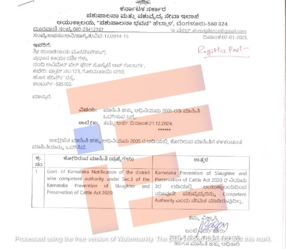 ಕರ್ನಾಟಕ ಗೋಹತ್ಯೆ ತಡೆಗಟ್ಟುವಿಕೆ ಮತ್ತು ಗೋ ಸಂರಕ್ಷಣೆ ಕಾಯ್ದೆ 2020 ಕಾಯ್ದೆಯಂತೆ ಅಧೀನ ಕಾಯ್ದೆ 18(1)ಡಿ) ಪ್ರಕಾರ ಪಶು ವೈದ್ಯರು ಸಕ್ಷಮ ಪ್ರಾಧಿಕಾರ ಎಂದು ನೇಮಕ ಮಾಡಿರುವುದಿಲ್ಲ ಎಂದು ಸರ್ಕಾರವೇ ಅಧಿಕೃತವಾಗಿ ಉತ್ತರ ನೀಡಿತ್ತು.