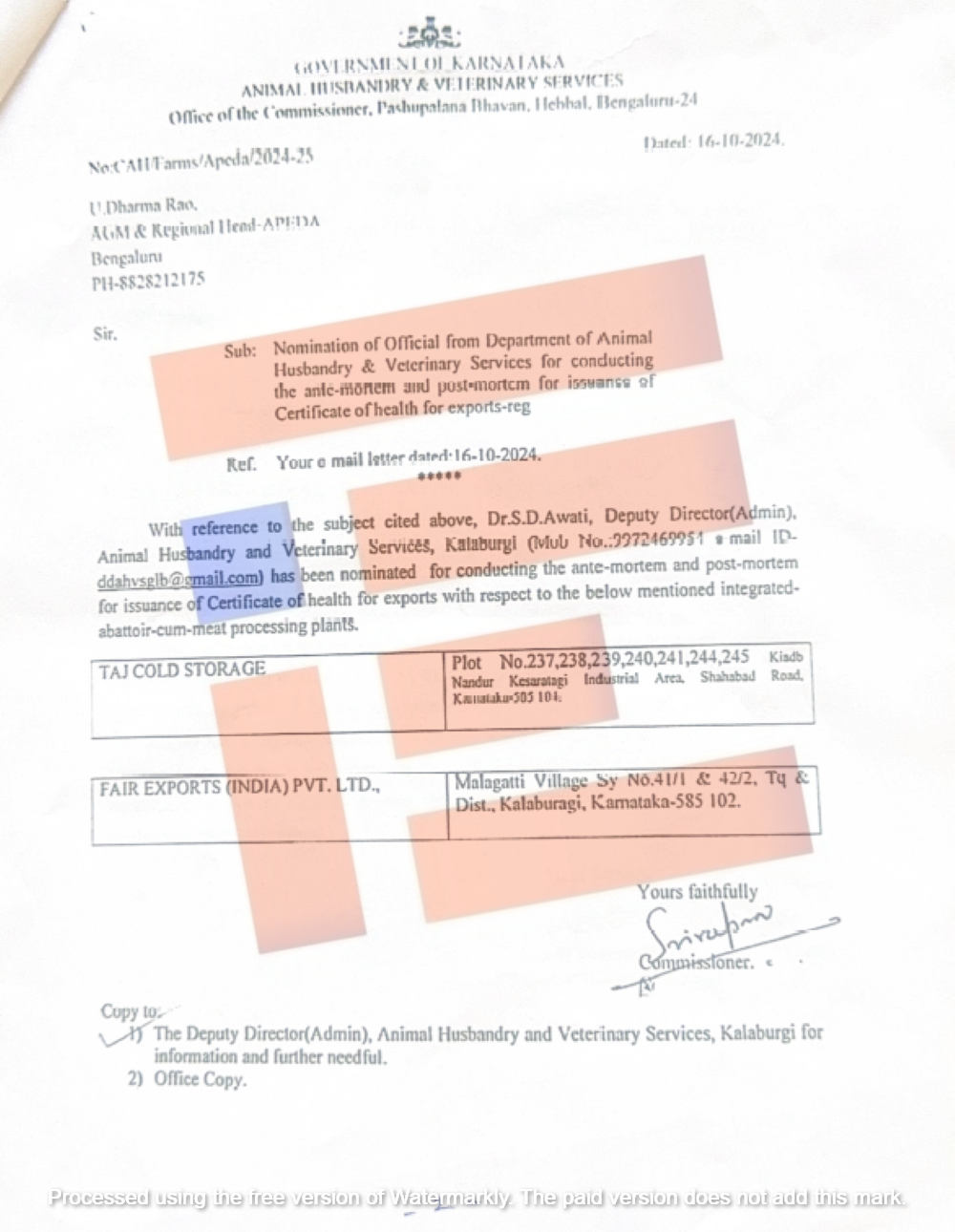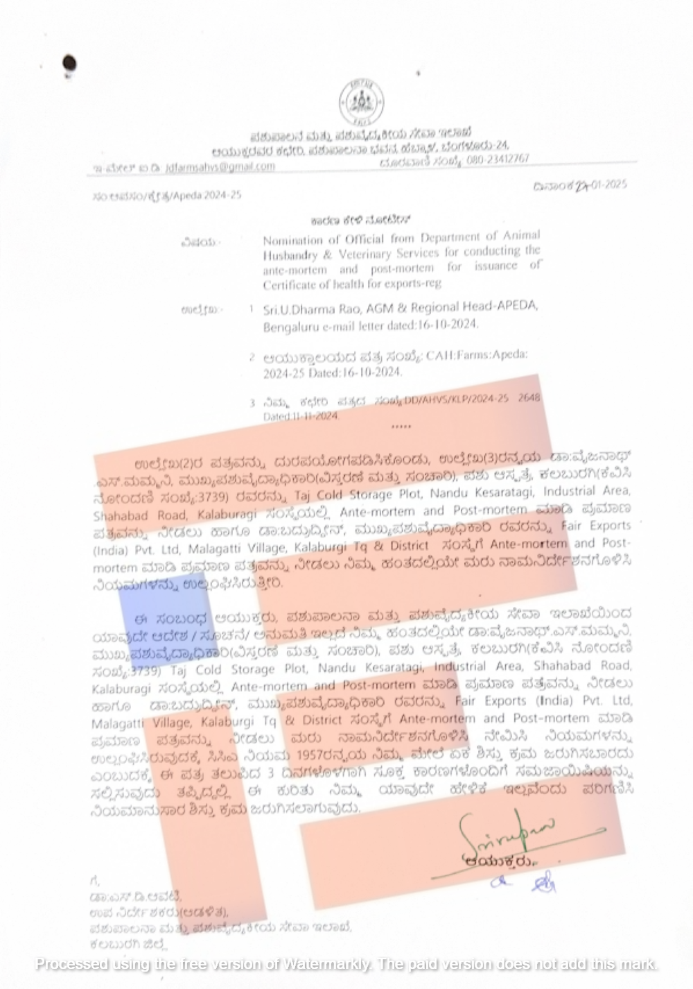 ಫೇರ್ ಎಕ್ಸ್ಪೋರ್ಟ್ಸ್ ಪ್ರೈವೈಟ್ ಲಿಮಿಟೆಡ್ ಮತ್ತು ತಾಜ್ ಕೋಲ್ಡ್ ಸ್ಟೋರೇಜ್ ಗೆ ಪ್ರಮಾಣ ಪತ್ರ ನೀಡಲು (Ante-Mortem and Post-Mortem) ಮುಖ್ಯ ಪಶು ವೈದ್ಯಾಧಿಕಾರಿ, ಪಶು ವೈದ್ಯಾಧಿಕಾರಿಗಳನ್ನು ಮರು ನಾಮನಿರ್ದೇಶನಗೊಳಿಸಿ ನೇಮಿಸಿ ನಿಯಮಗಳನ್ನು ಉಲ್ಲಂಘನೆ ಮಾಡಿರುತ್ತೀರಿ ಎಂದು ಆಪಾದಿಸಿತ್ತು.