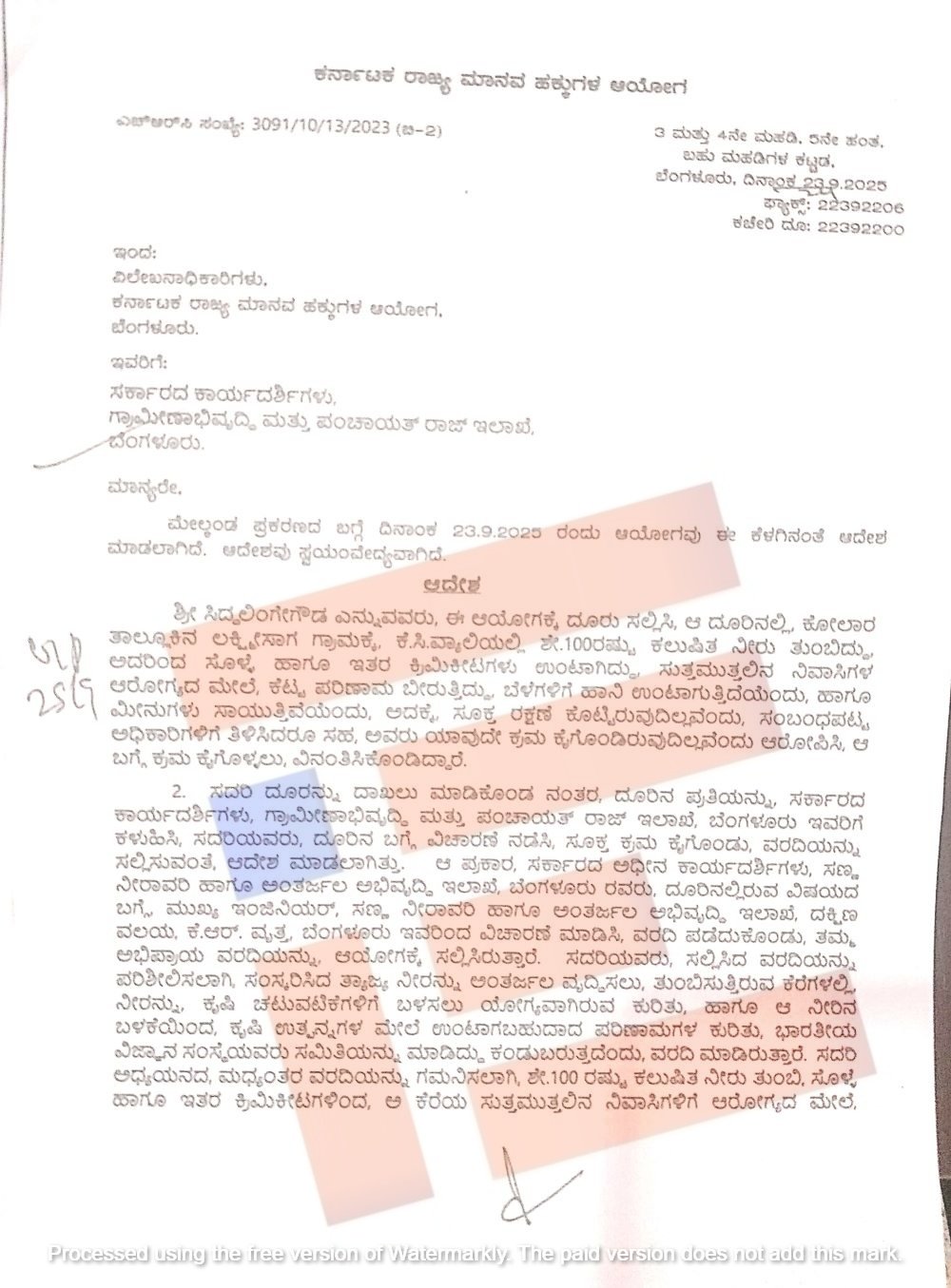 ಈ ದೂರನ್ನು ಸ್ವೀಕರಿಸಿದ್ದ ಕರ್ನಾಟಕ ರಾಜ್ಯ ಮಾನವ ಹಕ್ಕುಗಳ ಆಯೋಗವು ಇಡೀ ಪ್ರಕರಣವನ್ನು ಕುಂತಲ್ಲಿಯೇ ಮುಕ್ತಾಯಗೊಳಿಸಿದೆ. ಈ ಕುರಿತು ಆಯೋಗದ ವಿಲೇಖನಾಧಿಕಾರಿಗಳು 2025ರ ಸೆ. 23ರಂದು ಆದೇಶ ಹೊರಡಿಸಿದ್ದಾರೆ. ಈ ಆದೇಶದ ಪ್ರತಿಯನ್ನು ಗ್ರಾಮೀಣಾಭಿವೃದ್ದಿ ಮತ್ತು ಪಂಚಾಯತ್ರಾಜ್ ಇಲಾಖೆಯ ಸರ್ಕಾರದ ಕಾರ್ಯದರ್ಶಿಗಳಿಗೆ ಸಲ್ಲಿಸಿದೆ.