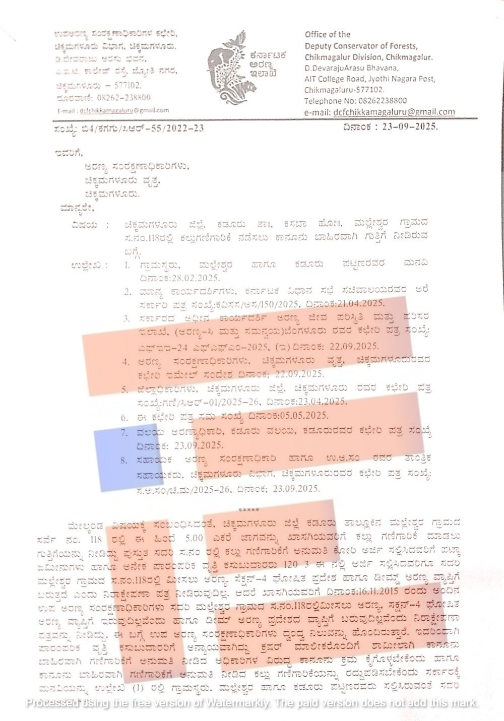 ಅಕ್ರಮ ಕಲ್ಲು ಗಣಿಗಾರಿಕೆ ನಡೆಯುತ್ತಿರುವ ಕುರಿತು ಮಲ್ಲೇಶ್ವರ ಗ್ರಾಮಸ್ಥರು ಮತ್ತು ಕಡೂರು ಪಟ್ಟಣದ ನಾಗರಿಕರು ಕರ್ನಾಟಕ ವಿಧಾನಸಭೆ ಸಚಿವಾಲಯ ಕಾರ್ಯದರ್ಶಿಗೆ 2025ರ ಫೆ.28ರಂದು ದೂರು ನೀಡಿದ್ದರು. ಈ ದೂರನ್ನಾಧರಿಸಿ ವಿಧಾನಸಭೆ ಸಚಿವಾಲಯದ ಕಾರ್ಯದರ್ಶಿಯು 2025ರ ಏಪ್ರಿಲ್ 21ರಂದು ಅರಣ್ಯ ಇಲಾಖೆಯ ಸರ್ಕಾರದ ಅಧೀನ ಕಾರ್ಯದರ್ಶಿಗೆ ಪತ್ರ ಬರೆದಿದ್ದರು. ಈ ಪತ್ರವನ್ನಾಧರಿಸಿ ಅರಣ್ಯ ಇಲಾಖೆಯು 4 ಪುಟಗಳ ವಸ್ತುನಿಷ್ಠ ವರದಿಯನ್ನು ಪಡೆದುಕೊಂಡಿದೆ.