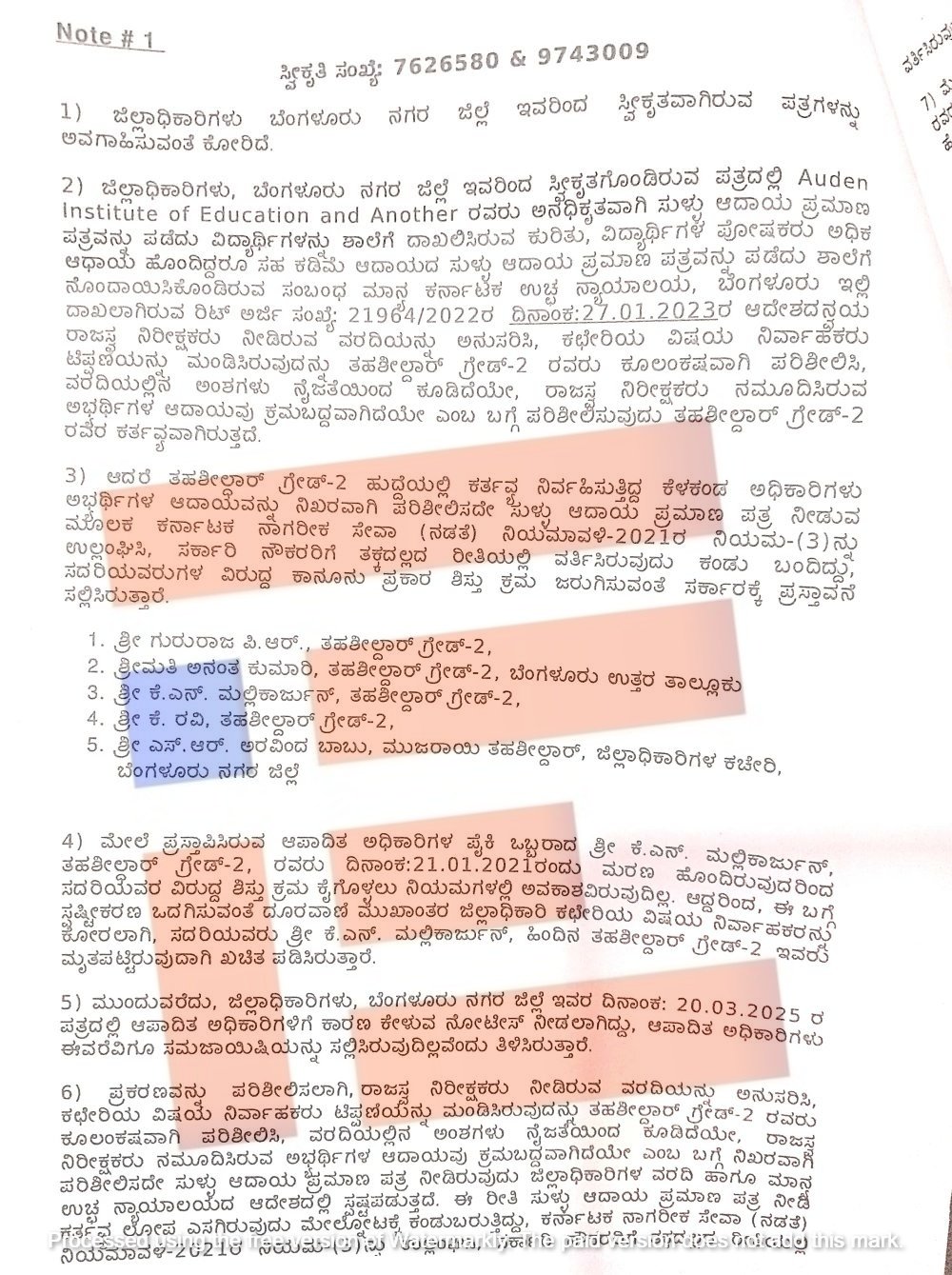 Auden Insttitute of Education ಸಂಸ್ಥೆಯ ಪ್ರಕರಣದಲ್ಲಿ ಗ್ರೇಡ್ 2 ತಹಶೀಲ್ದಾರ್ಗಳಾದ ಗುರುರಾಜ್ ಪಿ ಆರ್, ಅನಂತಕುಮಾರಿ, ಕೆ ಎನ್ ಮಲ್ಲಿಕಾರ್ಜುನ್, ಕೆ ರವಿ, ಎಸ್ ಆರ್ ಅರವಿಂದ ಬಾಬು ಅವರು ಅಭ್ಯರ್ಥಿಗಳ ಆದಾಯವನ್ನು ನಿಖರವಾಗಿ ಪರಿಶೀಲಿಸದೆಯೇ ಸುಳ್ಳು ಆದಾಯ ಪ್ರಮಾಣ ಪತ್ರವನ್ನು ನೀಡಿದ್ದಾರೆ. ಈ ಮೂಲಕ ಕರ್ನಾಟಕ ನಾಗರಿಕ ಸೇವಾ (ನಡತೆ) ನಿಯಮಾವಳಿ 2021ರ ನಿಯಮ (3) ವನ್ನು ಉಲ್ಲಂಘಿಸಿರುವುದು ರುಜುವಾತಾಗಿದೆ. ಈ ಪೈಕಿ ಕೆ ಎನ್ ಮಲ್ಲಿಕಾರ್ಜುನ್ ಅವರು ನಿಧನರಾಗಿದ್ದಾರೆ.