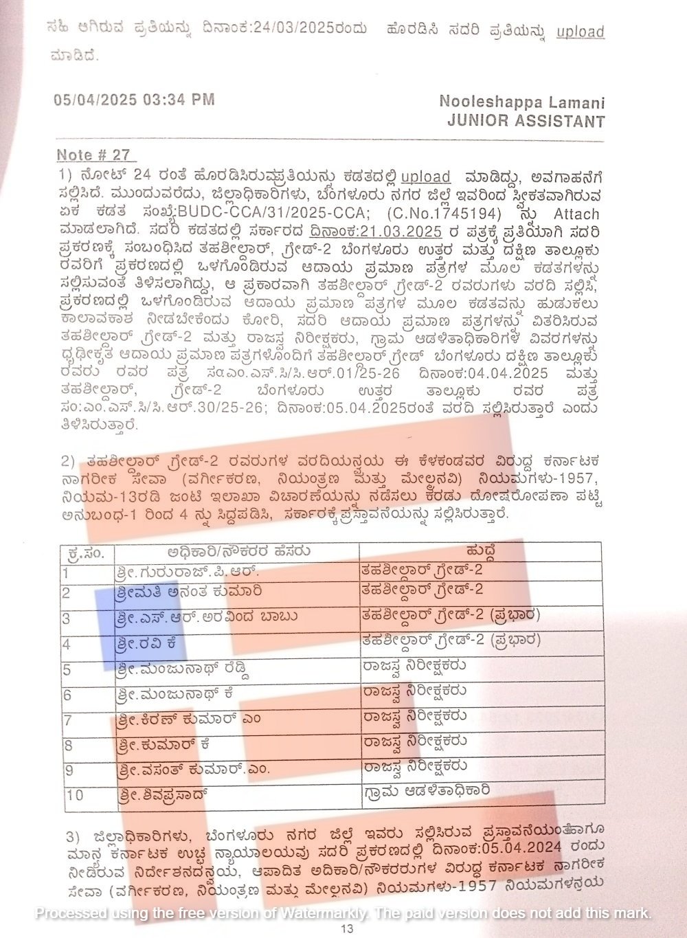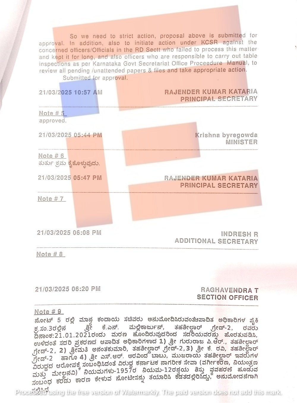 ಹೀಗಾಗಿ ಕಠಿಣ ಕ್ರಮ ಕೈಗೊಳ್ಳಬೇಕಾಗಿದೆ. ಈ ಮೇಲಿನ ಪ್ರಸ್ತಾವನೆಯನ್ನು ಅನುಮೋದನೆಗಾಗಿ ಸಲ್ಲಿಸಲಾಗಿದೆ. ಇದರ ಜೊತೆಗೆ, ಸಂಬಂಧಪಟ್ಟ ಅಧಿಕಾರಿಗಳು, ಈ ವಿಷಯವನ್ನು ಪ್ರಕ್ರಿಯೆಗೊಳಿಸಲು ವಿಫಲರಾಗಿದ್ದಾರೆ. ಮತ್ತು ಅದನ್ನು ಕಂದಾಯ ಇಲಾಖೆ ಅಧಿಕಾರಿಗಳು ಸಹ ದೀರ್ಘಕಾಲ ಉಳಿಸಿಕೊಂಡಿದ್ದಾರೆ. ಕರ್ನಾಟಕ ಸರ್ಕಾರಿ ಸಚಿವಾಲಯದ ಕಚೇರಿ ಕಾರ್ಯವಿಧಾನದ ಪ್ರಕಾರ ಪರಿಶೀಲನೆಗಳನ್ನು ನಡೆಸುವ ಜವಾಬ್ದಾರಿಯಯನ್ನು ನಿಭಾಯಿಸದ ಅಧಿಕಾರಿಗಳ ವಿರುದ್ಧವೂ ಕೆಎಸ್ಸಿಆರ್ ಅಡಿಯಲ್ಲಿ ಕ್ರಮ ಕೈಗೊಳ್ಳಬೇಕು ಎಂದು ಟಿಪ್ಪಣಿಯಲ್ಲಿ ನಿರ್ದೇಶನ ನೀಡಿರುವುದು ಗೊತ್ತಾಗಿದೆ.