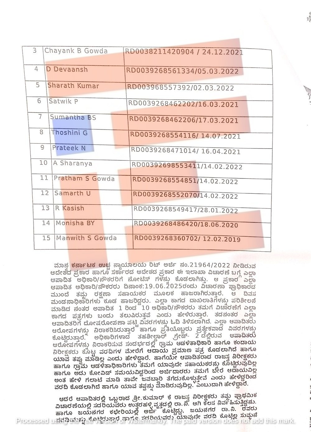 ಸಮರ್ಥ ಯು (ಆರ್ ಡಿ 0039268552070/ 14.02.2022), ಆರ್ ಕಾಶೀಶ್ ( ಆರ್ ಡಿ 0039268549417/28.01.2022), ಮೊನಿಶಾ ಬಿ ವೈ ( ಆರ್ ಡಿ 0039268486420./ 18.06.2020), ಮನ್ವಿತ್ ಎಸ್ ಗೌಡ (ಆರ್ ಡಿ 0039268360702/12.02.2019) ಅವರು ತಪ್ಪು ಮಾಹಿತಿ ನೀಡಿ ಆದಾಯ ಪ್ರಮಾಣ ಪತ್ರ ಪಡೆದುಕೊಂಡಿರುವ ಪಟ್ಟಿಯಲ್ಲಿದ್ದಾರೆ.