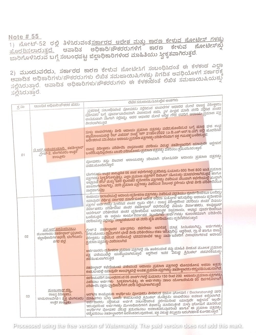 ಉಳಿದ ಆಪಾದಿತ ಅಧಿಕಾರಿಗಳಿಗೆ ಕಾರಣ ಕೇಳಿ ನೋಟೀಸ್ ಕೂಡ ಜಾರಿ ಮಾಡಲಾಗಿತ್ತು. ಆದರೆ ಆಪಾದಿತ ಅಧಿಕಾರಿಗಳು ಆರಂಭಿಕ ಹಂತದಲ್ಲಿ ಸಮಜಾಯಿಷಿ ನೀಡಿರಲಿಲ್ಲ. ಈ ಪ್ರಕರಣವನ್ನು ಕಂದಾಯ ಇಲಾಖೆಯ ಸರ್ಕಾರದ ಪ್ರಧಾನಕಾರ್ಯದರ್ಶಿ ರಾಜೇಂದರ್ ಕುಮಾರ್ ಕಟಾರಿಯಾ ಅವರು ಗಂಭೀರವಾಗಿ ಪರಿಗಣಿಸಿದ್ದರು.