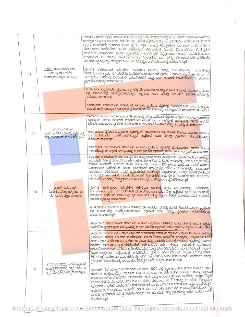 ಆಪಾದಿತ ಅಧಿಕಾರಿಗಳು ಲಿಖಿತ ಸಮಜಾಯಿಷಿಯನ್ನು ನೀಡಿದ್ದಾರೆ. ಬಹುತೇಕ ಅಧಿಕಾರಿಗಳು ತಮ್ಮ ಮೇಲಿನ ಆರೋಪವನ್ನು ನಿರಾಕರಿಸಿದ್ದಾರೆ. ರಾಜಸ್ವ ನಿರೀಕ್ಷಕರು ಪರಿಶೀಲಿಸಿ ವಾಸ್ತವಾಂಶದ ವರದಿ ವಿರುದ್ಧ ತಹಶೀಲ್ದಾರ್ರಿಗೆ ಯಾವುದೇ ಆಕ್ಷೇಪಣೆ ಬಂದಿರುವುದಿಲ್ಲ. ಇದನ್ನು ಖಾತರಿಪಡಿಸಿಕೊಂಡು ಪ್ರಮಾಣ ಪತ್ರ ವಿತರಿಸಲು ಕ್ರಮ ಕೈಗೊಳ್ಳಲಾಗಿದೆ.