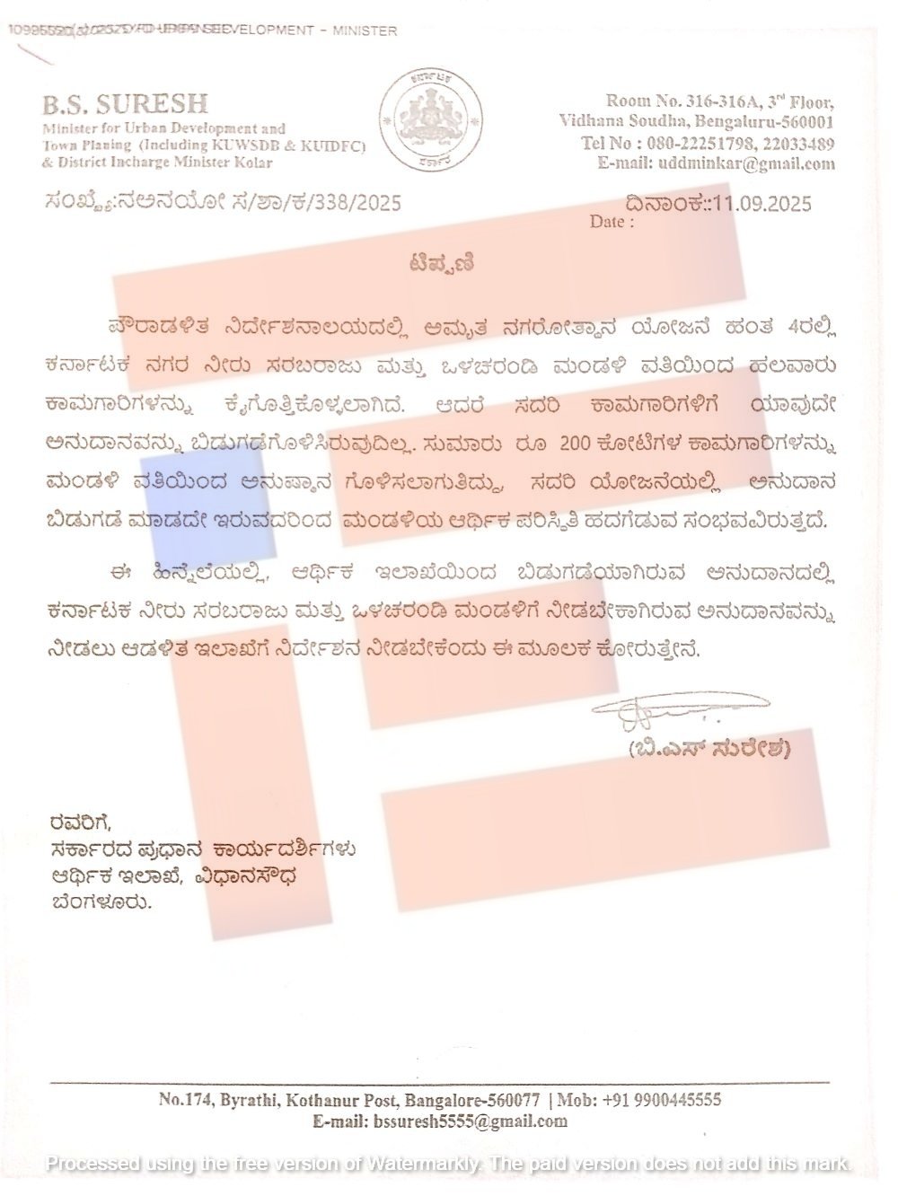 ನಗರಾಭಿವೃದ್ಧಿ ಸಚಿವ ಬೈರತಿ ಸುರೇಶ್ ಅವರು ಆರ್ಥಿಕ ಇಲಾಖೆಯ ಸರ್ಕಾರದ ಪ್ರಧಾನ ಕಾರ್ಯದರ್ಶಿಗೆ 2025ರ ಸೆ.11ರಂದು ಪತ್ರ ಬರೆದಿದ್ದಾರೆ. ಈ ಪತ್ರದ ಪ್ರತಿಯು ‘ದಿ ಫೈಲ್’ಗೆ ಲಭ್ಯವಾಗಿದೆ.