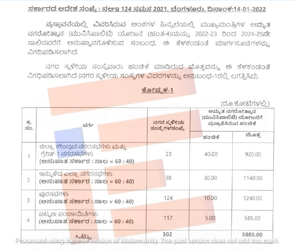 ಜಿಲ್ಲಾ ಕೇಂದ್ರದ ನಗರಸಭೆಗಳು ಮತ್ತು ಗ್ರೇಡ್ 1 ನಗರಸಭೆಗಳು (23) ಅಮೃತ ನಗರೋತ್ಥಾನ ಮುನಿಸಿಪಾಲಿಟಿ ಯೋಜನೆಗೆ 920.00 ಕೋಟಿ, ಇನ್ನುಳಿದ 38 ಎಲ್ಲಾ ನಗರಸಭೆಗಳು 1,1140 ಕೋಟಿ, ಪುರಸಭೆಗಳು 1,240 ಕೋಟಿ, 117 ಪಟ್ಟಣ ಪಂಚಾಯ್ತಿಗಳಿಗೆ 585 ಕೋಟಿ ಸೇರಿ ಒಟ್ಟಾರೆ 3,885 ಕೋಟಿ ರು.ಗಳನ್ನು ಒದಗಿಸಿತ್ತು.