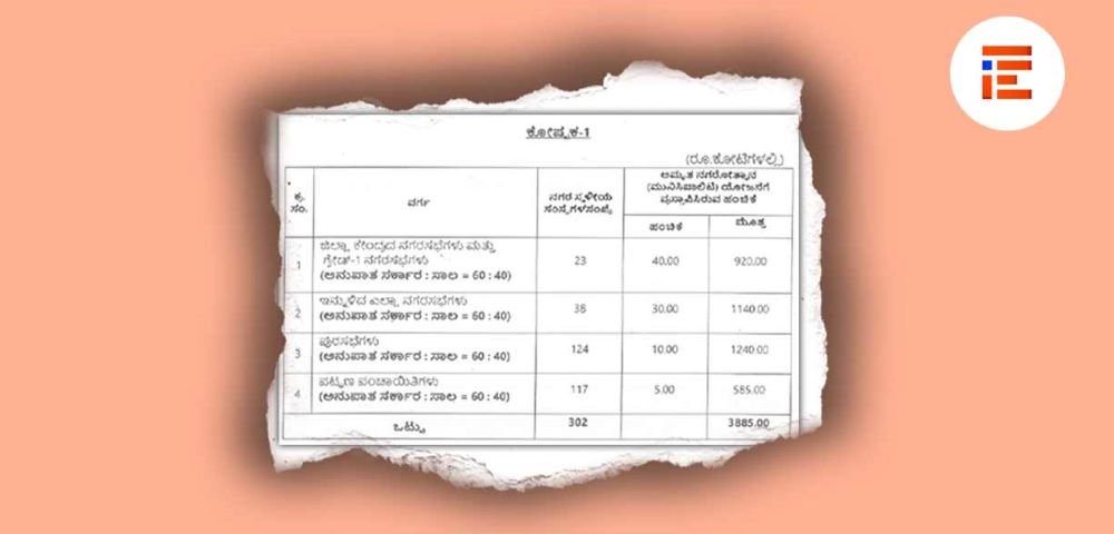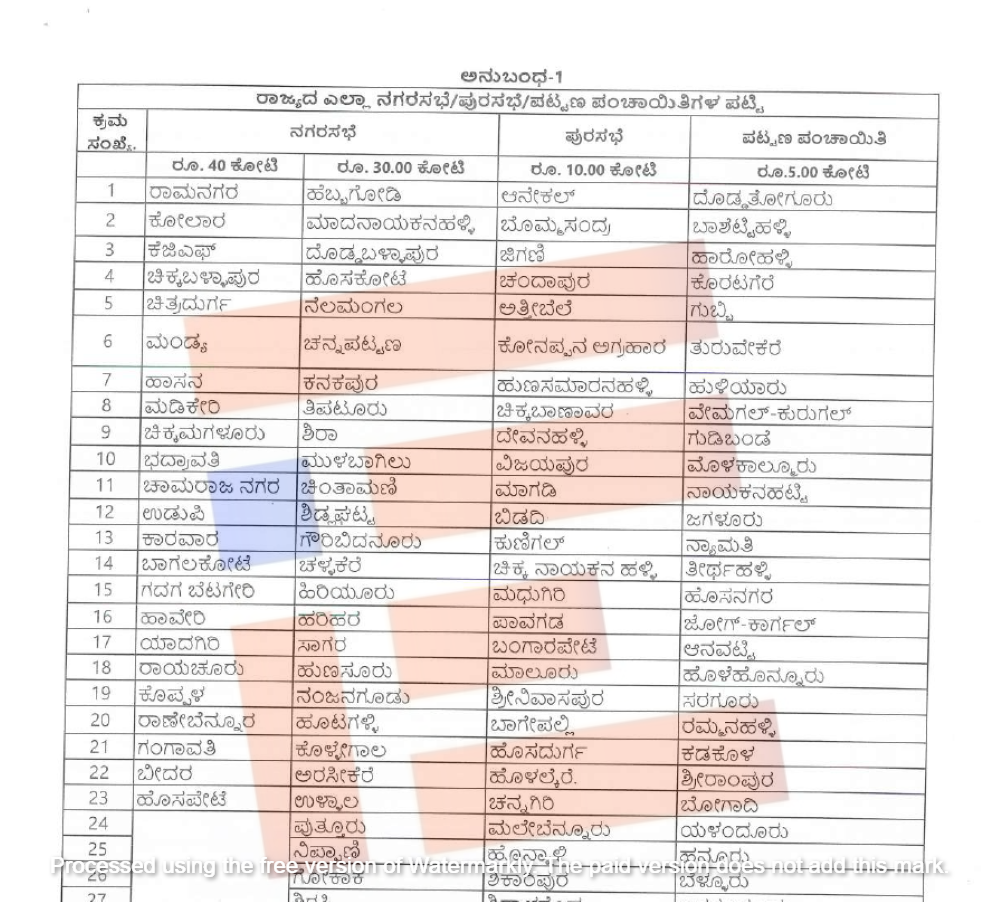 ಒಟ್ಟು 23 ನಗರಸಭೆಗಳಿಗೆ ತಲಾ 40 ಕೋಟಿ, ಇನ್ನುಳಿದ 38 ನಗರಸಭೆಗಳಿಗೆ ತಲಾ 30 ಕೋಟಿ, 124 ಪುರಸಭೆಗಳಿಗೆ ತಲಾ 10 ಕೋಟಿ, 117 ಪಟ್ಟಣ ಪಂಚಾಯ್ತಿಗಳಿಗೆ ತಲಾ 5 ಕೋಟಿ ರು ಗಳನ್ನು ಮಂಜೂರು ಮಾಡಿತ್ತು.
